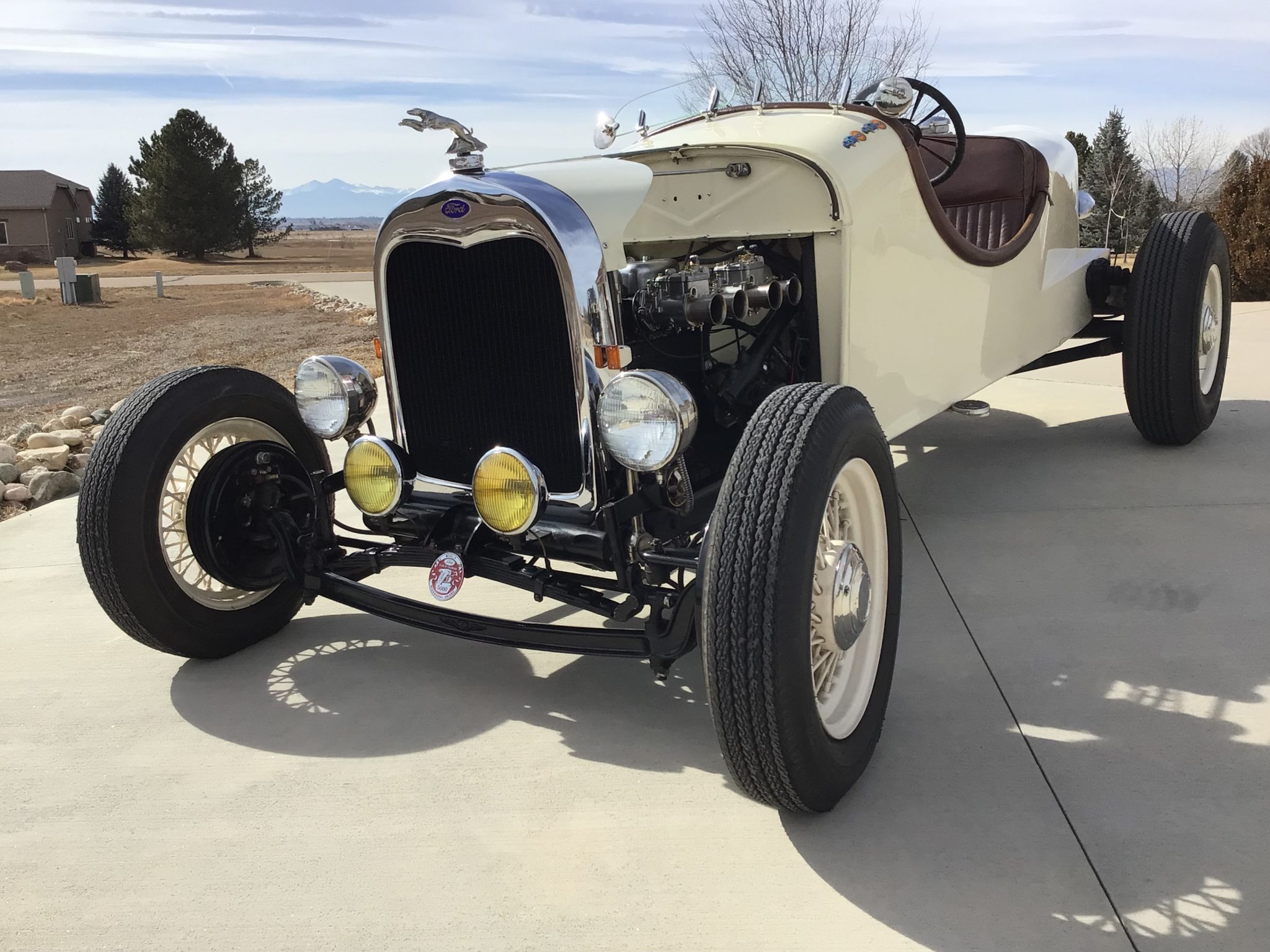 This custom 1929 Ford Model A features hand-fabricated boattail bodywork, creating a unique speedster silhouette with white paint and brown upholstery. Powering the car is a 1950s-era engine build using a Model B Diamond block enhanced with a Riley 4-port head, dual Weber carbs, and a custom exhaust system. Riding on 16-inch wire wheels, this speedster showcases its classic style with modern mechanical updates.