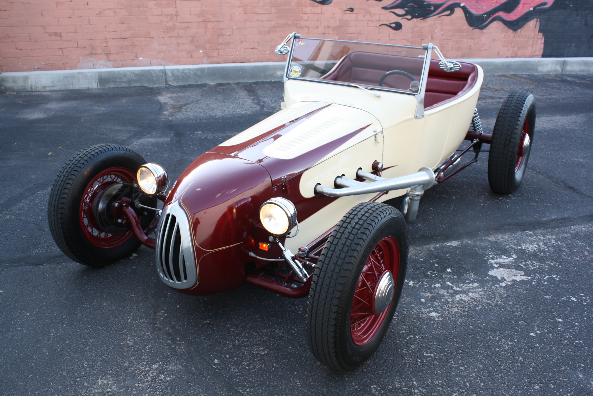 This striking Ford Model T roadster is a fusion of vintage style and modern power, featuring a fiberglass body over a tube-frame chassis and powered by a Chevrolet LT1 V8 engine paired with a Turbo 350 automatic transmission. The car's cream body with red scallops, Kelsey-Hayes wire wheels, and custom headers enhance its hot rod persona, making it a standout build.