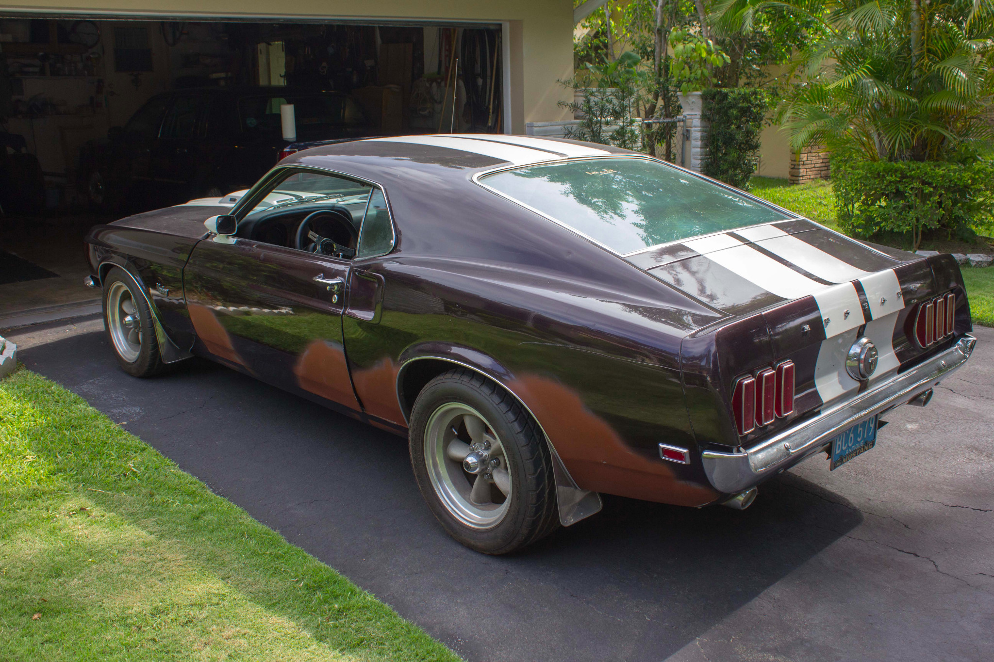 This 1969 Ford Mustang Fastback is a powerful build featuring a Sehr 351 stroker engine, faded purple paint, and racing enhancements. The body shows a scruffy, original look with primer spots and white stripes, while the interior boasts racing seats and modern accessories for a sturdy, thrilling ride.