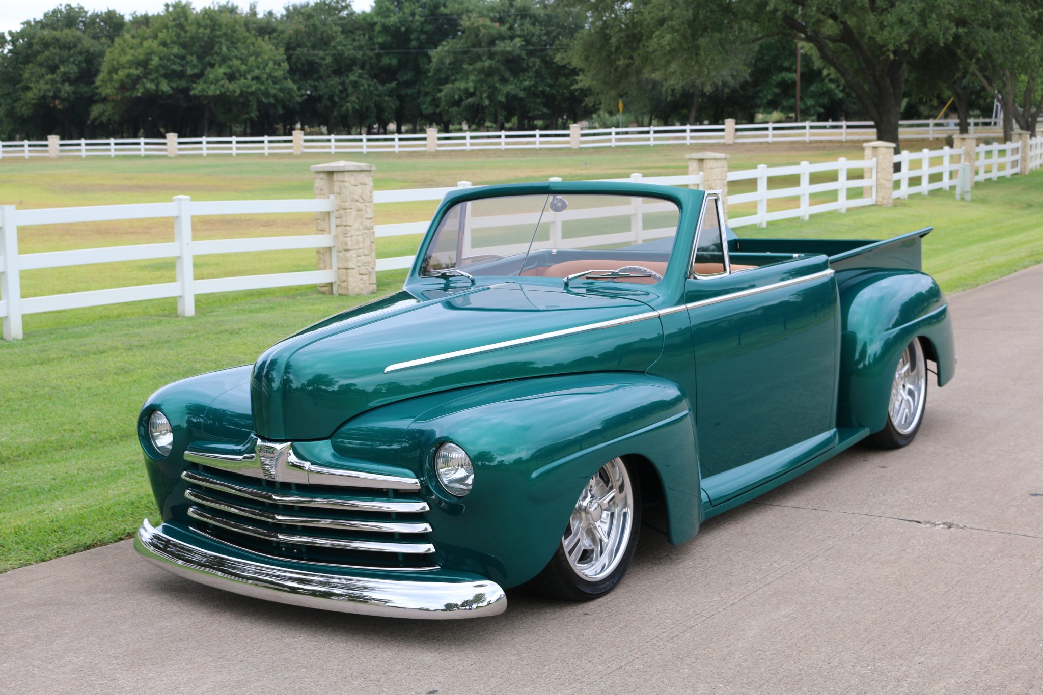 This custom 1947 Ford Roadster Pickup features a striking metallic green finish and a unique convertible build by Roger Burman at Lakeside Rods and Rides. Equipped with a 350ci V8 and C4 Corvette suspension, it boasts a lowered stance, frenched headlights, and shaved handles.