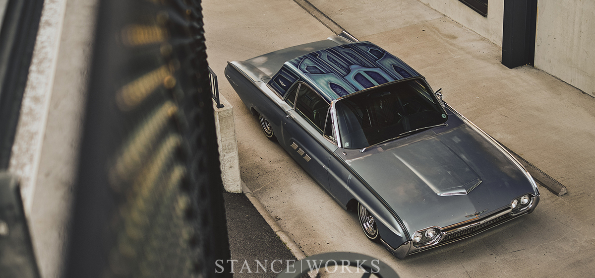 Joni Nurmio's 1963 Ford Thunderbird combines a unique patina with a striking lowrider-style painted roof, creating a captivating visual impact. Fitted with Supreme 48 wheels and a bagged suspension setup, this T-Bird offers a sublime stance and stands out as a cruiser's delight.