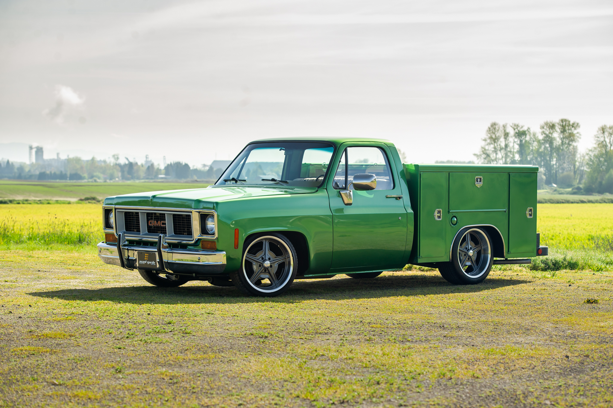 This 1974 GMC C1500 Custom pickup, refinished in Killarney Green Metallic, features a Pacific utility bed and has been modified for enhanced performance and comfort. Under the hood is a 350ci V8 crate engine, installed by Kreative Images, paired with a three-speed Hydra-Matic automatic transmission. The truck rides on a lowered suspension with 20″ Billet Specialties wheels and is equipped with power steering and power-assisted front disc brakes. It includes modern amenities like Vintage Air climate control and an aftermarket stereo system. The vehicle was sold at auction with proceeds donated to Habitat for Humanity. This 1974 GMC C1500 Custom pickup features a Pacific utility bed and is refinished in metallic green. Powered by a 350ci V8 crate engine with an Edelbrock carburetor and a three-speed automatic transmission, this truck also includes power steering, a lowered suspension, and 20" Billet Specialties wheels. The interior boasts a Saddle cloth and vinyl bench seat, Vintage Air climate control, and an aftermarket stereo. The vehicle comes with a clean Oregon title and service records.