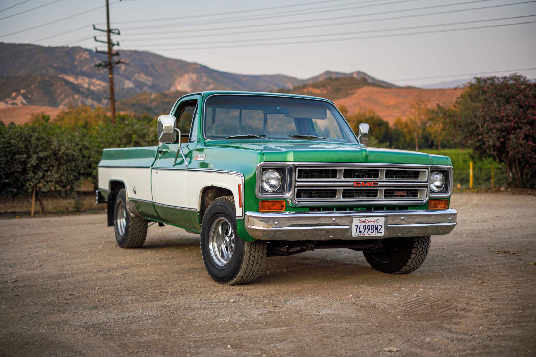 This 1974 GMC C1500 Sierra Super Custom features a 350ci V8 engine paired with a three-speed TH400 automatic transmission. The truck is finished in Killarney Green and white, a repaint from approximately 15 years ago. Notable modifications include aftermarket five-spoke wheels, a Kenwood cassette stereo, and a black plastic bed liner. Inside, it has a Saddle custom cloth interior with faux-woodgrain trim. Maintenance included an oil change and a replacement carburetor, which requires adjustment. The air conditioning is non-functional and the valve covers leak. The truck has been in California, with the frame showing corrosion.