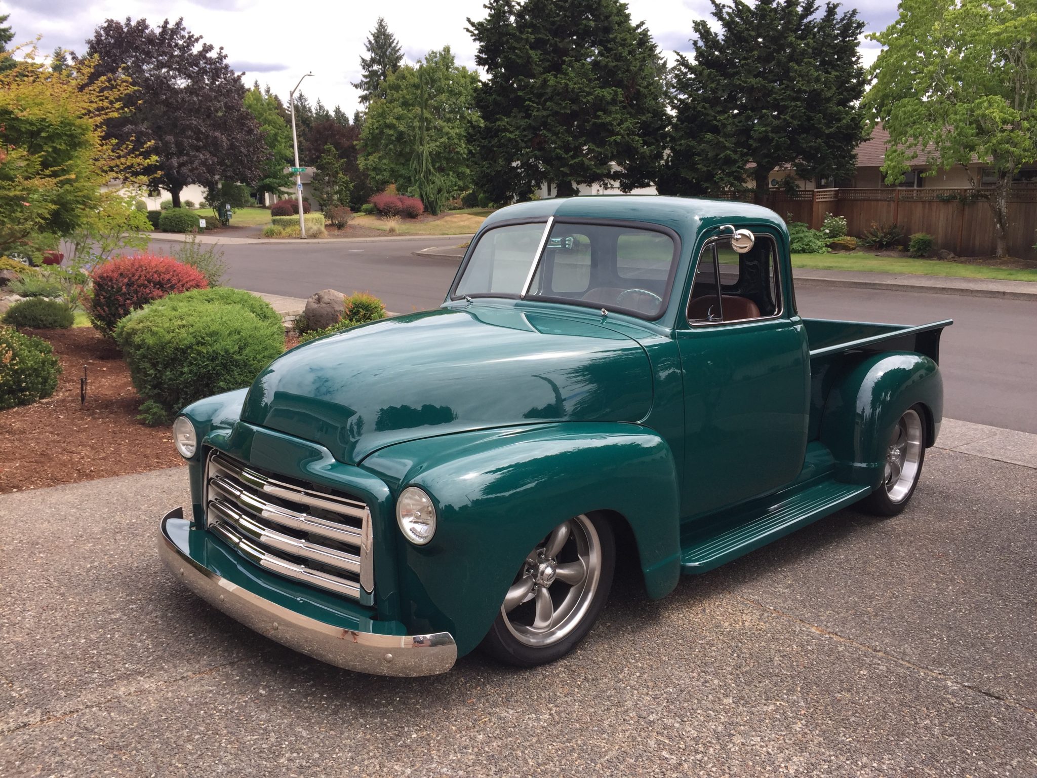 This 1953 GMC Series 101-22 features a stylishly refurbished five-window cab, finished in Atlas Green Blue. It's powered by a ZZ4 V8 engine with FiTech fuel injection, complemented by a TCI automatic transmission. The custom touches include a MAR-K wood-lined bed, Coys 18-inch wheels, coilover suspension, and modern amenities like power windows and LED lighting.