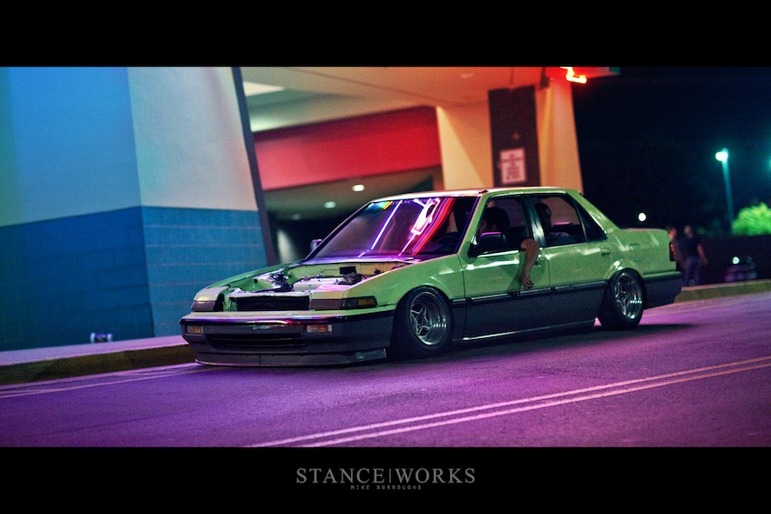 Cory Hutchison's 1989 Honda Accord, known as Nelson, embodies the spirit of extreme customization with its vibrant Montana Linden Green rattle-can paint and ultra-low stance. This 80s retro marvel rolls on rare 13x7 Enkei AP racing wheels, redefining style with a tucked engine bay and minimalist design. Its audacious presence and unique character make it a standout creation.