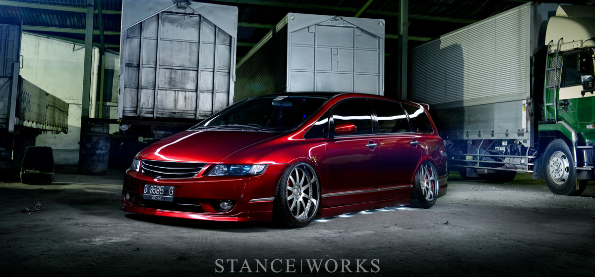 Edbert Wijaya's Honda Odyssey transcends minivan norms with a striking VIP build, featuring a custom one-off body kit, candy red paint, and a plush re-trimmed interior. This Indonesian masterpiece rides on 20-inch Modulare Forged M15 wheels and a hydraulic suspension setup, embodying the elegance and boldness of VIP style.