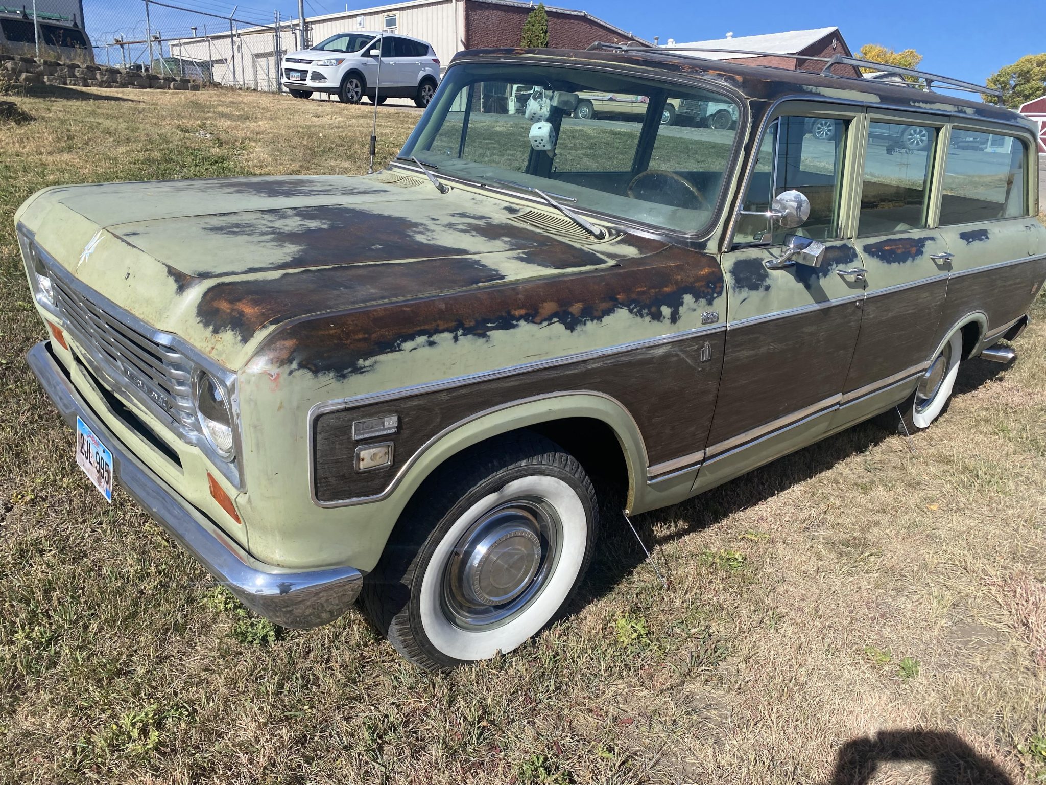 This 1974 International Harvester Travelall 100 Custom is finished in Burnished Gold Metallic with woodgrain side panels. It features a 360ci V8 engine mated to a three-speed automatic transmission and is equipped with a roof rack, power steering, and power-assisted brakes. The interior is trimmed in Sage nylon and vinyl, and includes amenities like air conditioning and a push-button radio. The 15" steel wheels with polished hubcaps are mounted with Wild Country tires. Sold in Rapid City, South Dakota, it is offered with a clean title.