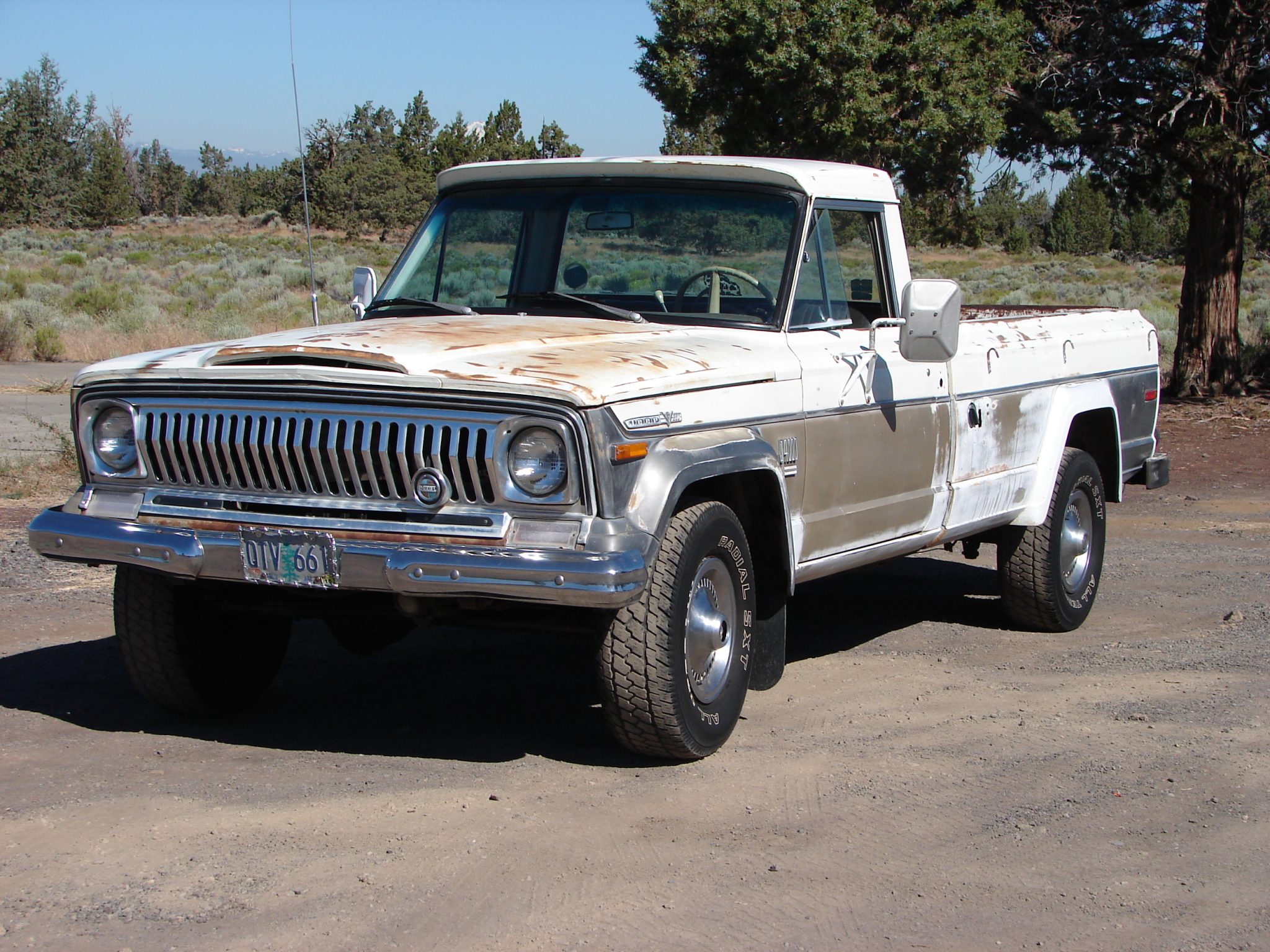 This 1972 Jeep J4000 Custom Cab pickup, owned by the seller for 25 years, features a 360ci AMC V8 engine paired with a three-speed TH400 automatic transmission and a dual-range transfer case. The truck is finished in a combination of white and beige and includes 15-inch steel wheels with Avon Radial SXT All Terrain tires. Notable features are power steering and brakes, manually locking front hubs, and a dual exhaust system with glasspack-style mufflers. Recent maintenance work includes a rebuilt brake booster and carburetor, and new master cylinder, battery, thermostat, radiator hoses, ignition points, and spark plugs. Offered with a clean Oregon title, this truck displays some paint wear and rust but maintains its rugged charm.
