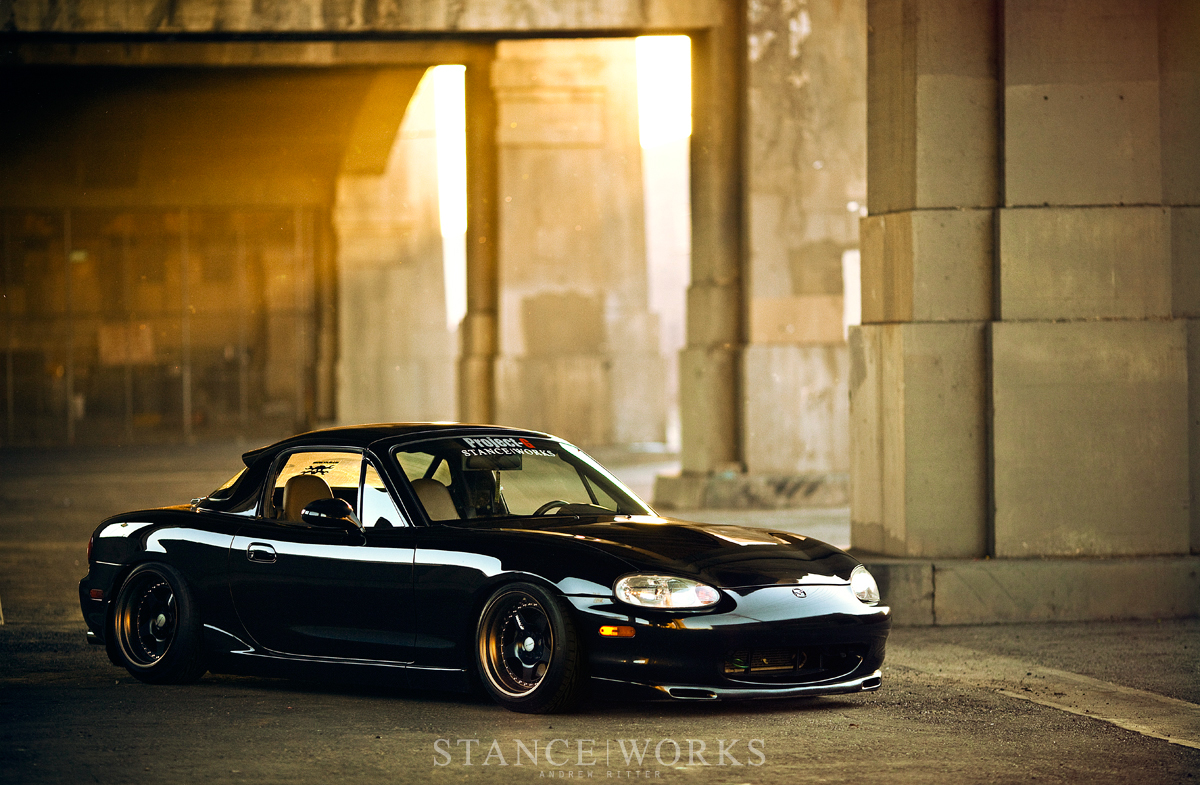 Evan Gillis's 1999 Miata turns heads with its glossy black paint in the Southern California show scene. Despite its slammed stance, the car navigates daily commutes across Los Angeles, showcasing a dedication to both practicality and passion.
