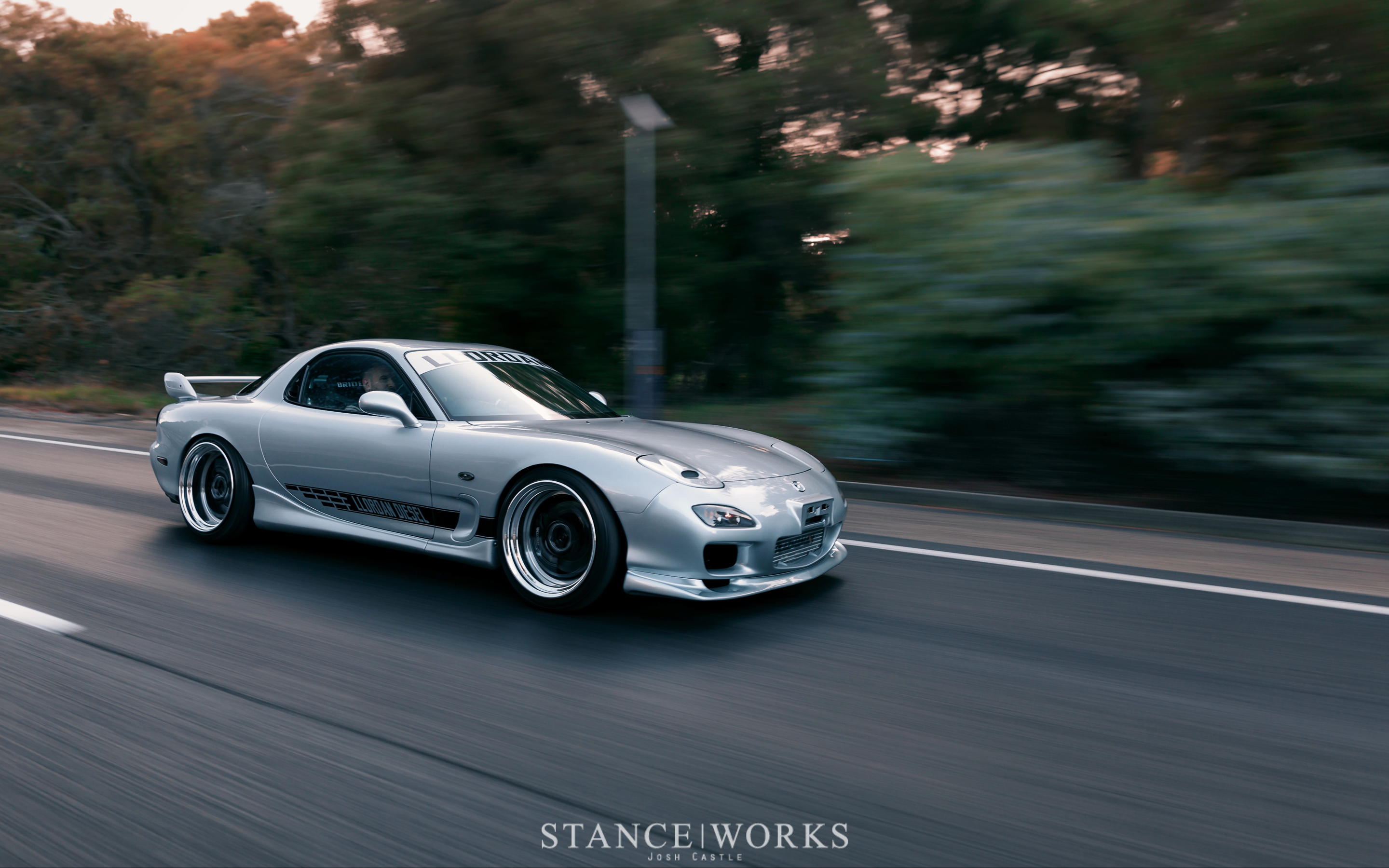 Adam Cannell's Mazda RX7 FD exemplifies automotive excellence with its Dowelled bridge-port 13B rotary engine and striking silver paint. It features an aggressive stance with Work SP1 wheels and a blend of Tein coilover and Stance Parts air cup suspension, all while maintaining authentic interior touches like Bride Stradia 2 seats.