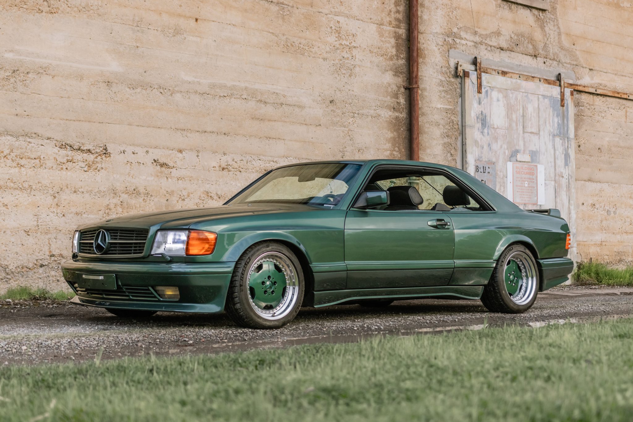This striking Mercedes-Benz 560SEC features an AMG widebody conversion with Malachite Green Metallic paint, accentuated by front and rear spoilers, and sits on 17-inch AMG Aero III wheels. Inside, Belgian coachbuilders Carat Duchatelet have transformed the cabin with black and green buffalo leather, highlighted by Recaro front seats and burl wood trim.