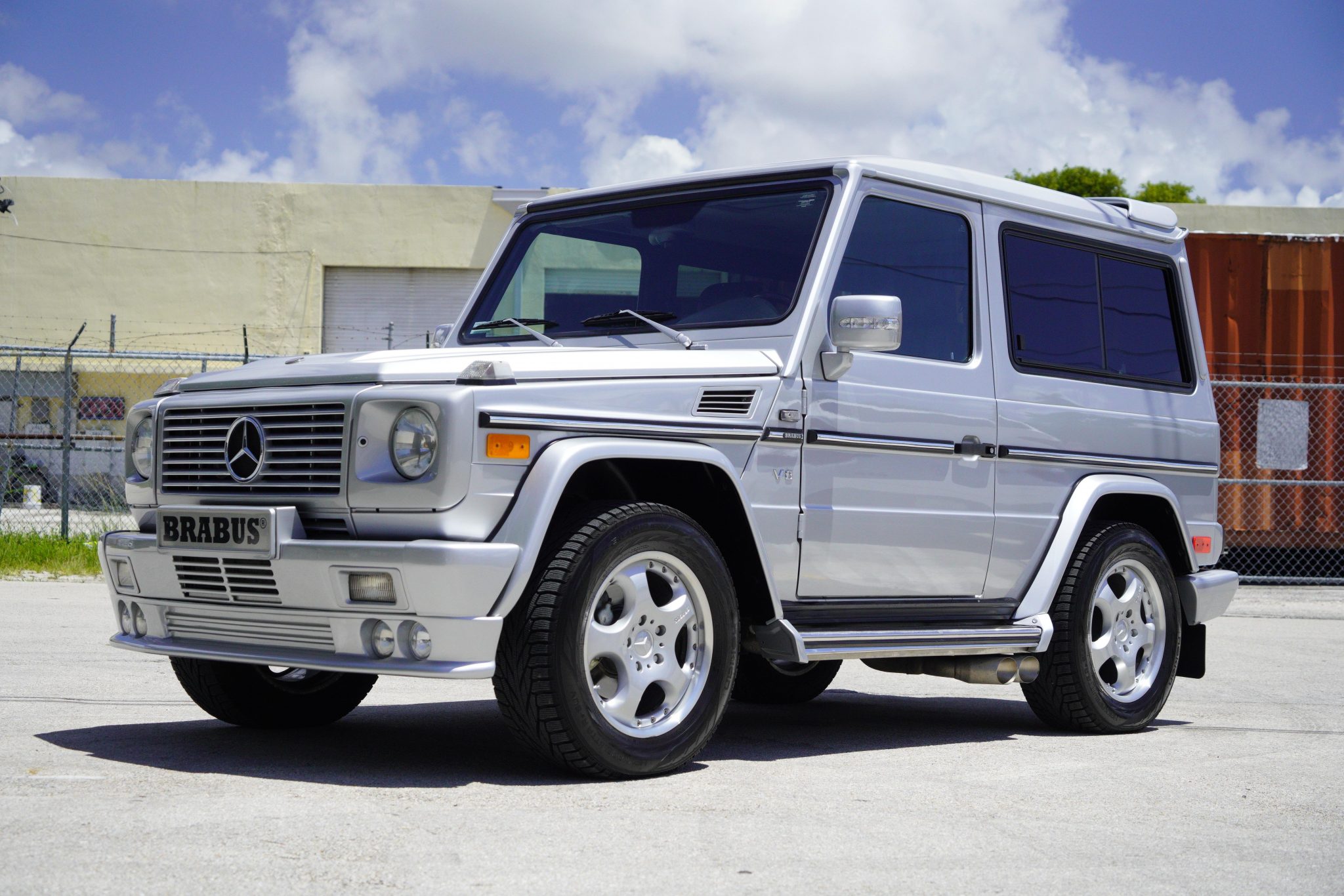 A 1999 Mercedes-Benz G500 modified by Brabus, featuring Brilliant Silver paint, Brabus exterior styling, and a black/gray leather interior. It includes a Brabus-tuned 5.8-liter V8, 18" Brabus wheels, and notable features like locking differentials, xenon headlamps, and a sunroof.