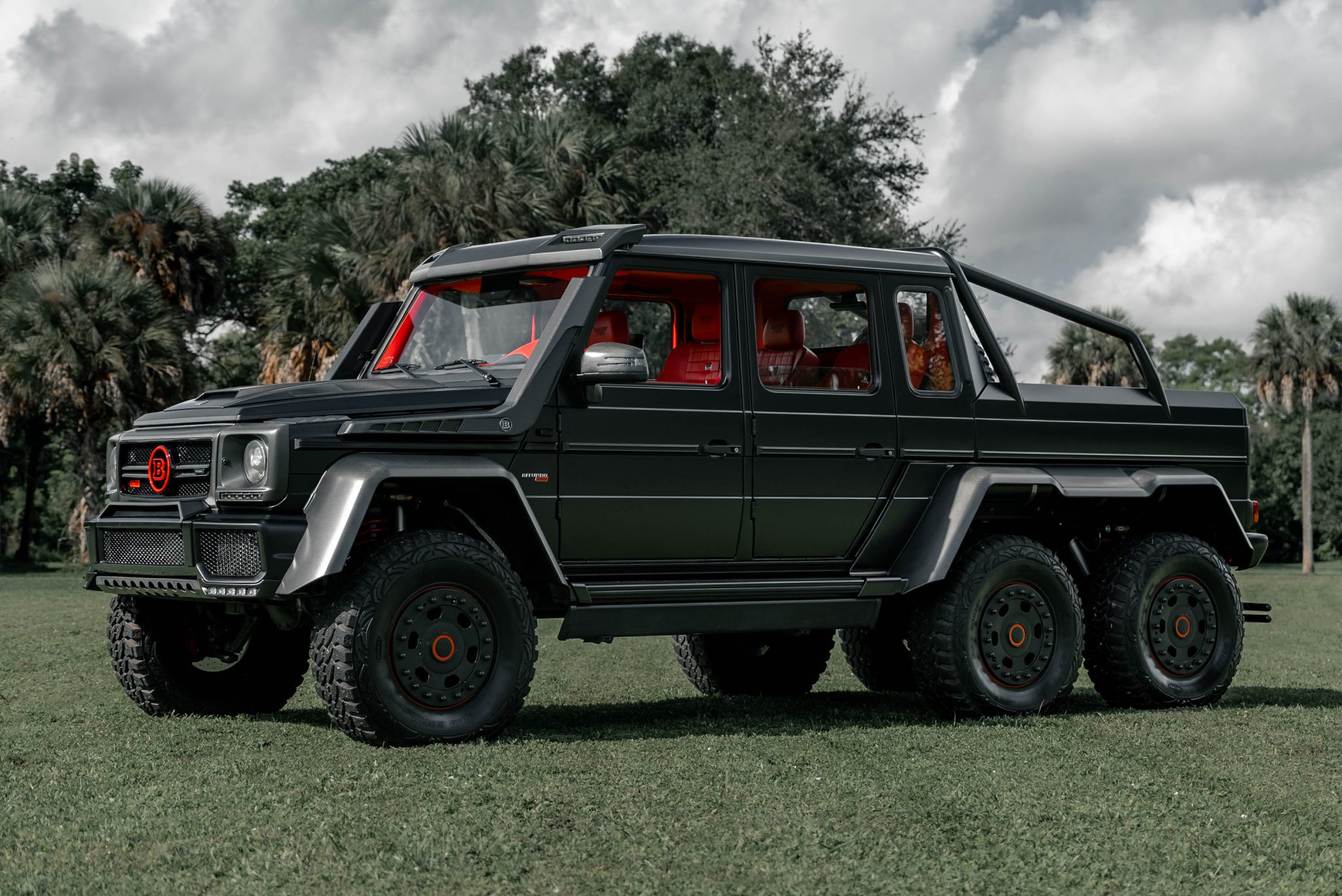 This rare 2014 Mercedes-Benz G63 AMG 6×6 features a Brabus G700 package with a satin black finish. It includes carbon-fiber accents, a wood cargo bed, and 18" Hutchinson beadlock wheels. The red leather interior and extensive off-road capabilities complete its striking profile.