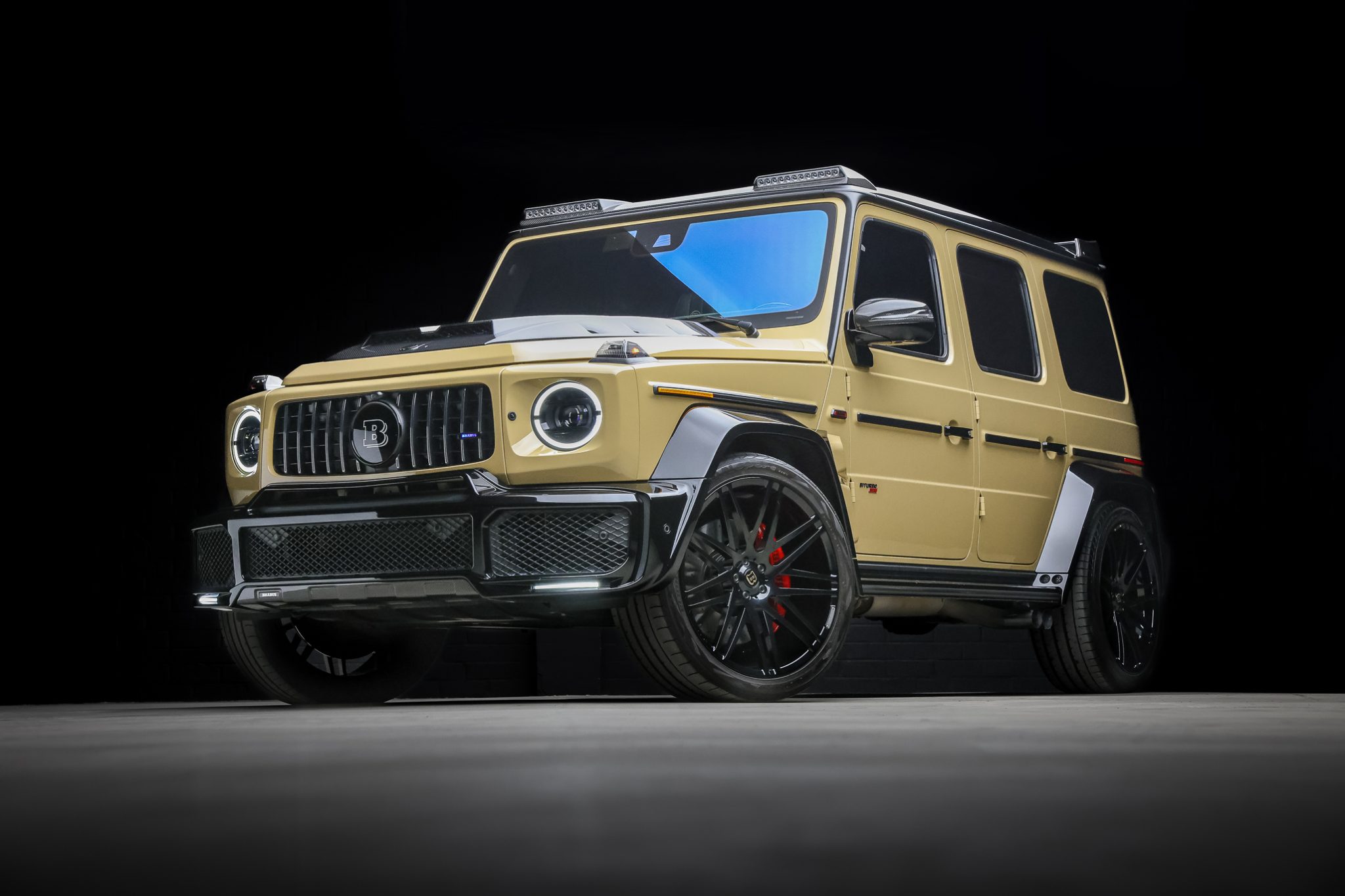 - Brabus Widestar conversion kitCarbon-fiber exterior trimBrabus illuminated grille-bar logoBrabus badgingRear roof spoilerSpare tire coverSunroofSide-exit exhaust outletsAMG Night Package Plus
