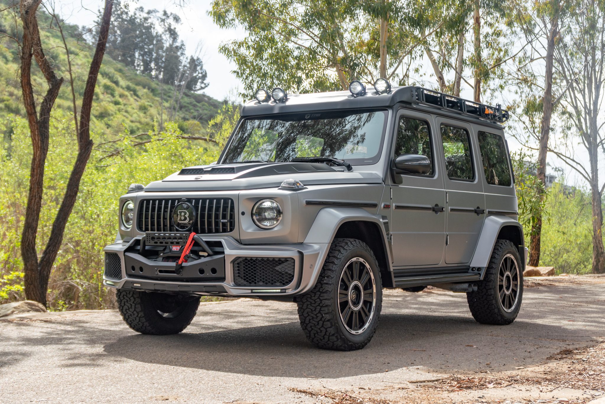 - Brabus Widestar body kitWarn winchCarbon-fiber hoodRear-mounted ladderRoof rack with LED lightsValve-controlled exhaust systemBrabus G700 Widestar body kitroof rackcarbon-fiber exterior trimglass sunroofautomatic-retracting side stepsBrabus badgingLED lighting