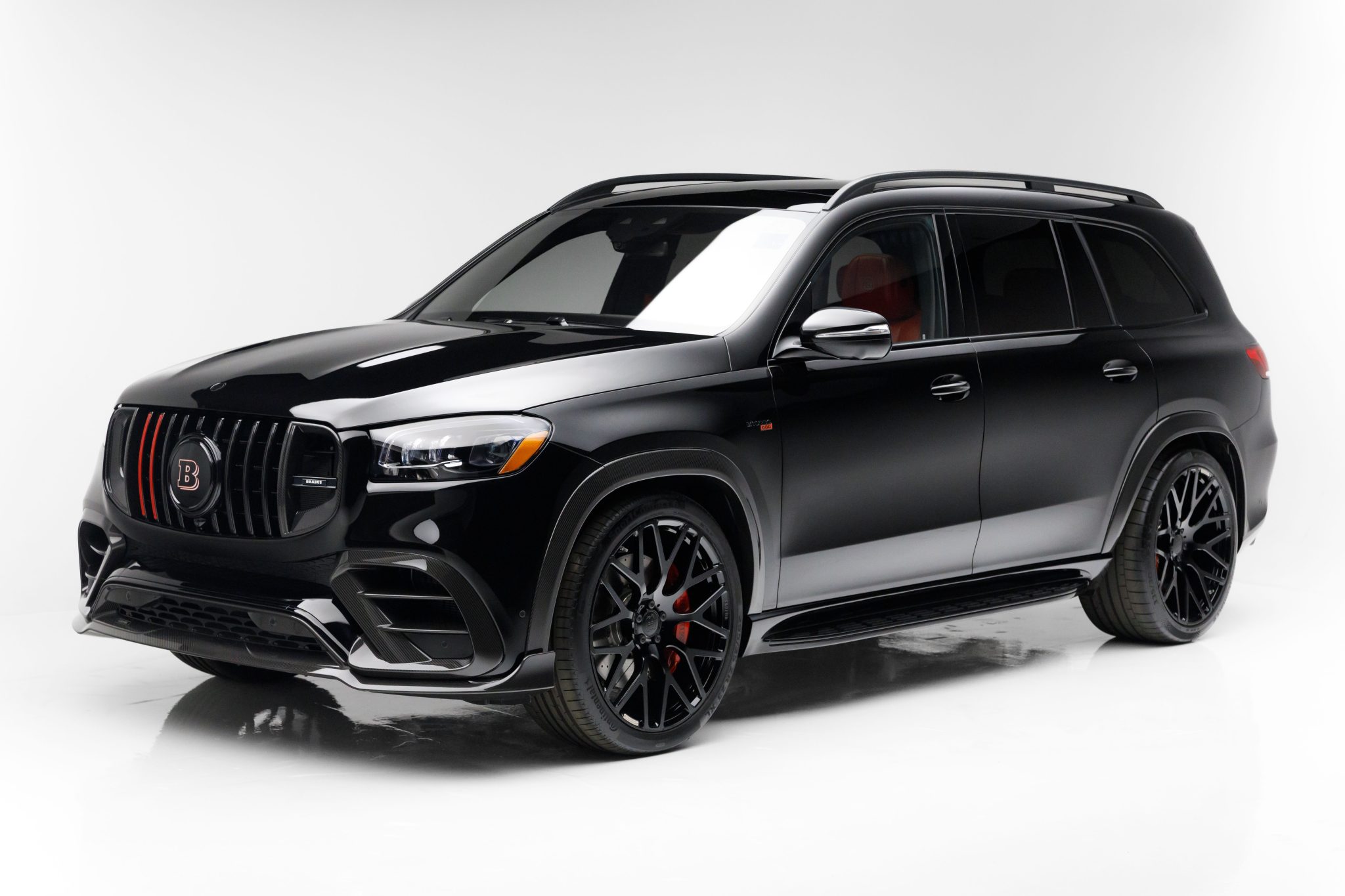 - Brabus exposed carbon-fiber aerodynamic elementsIlluminated front emblemBrabus Dua Cube Red leather upholsteryBrabus stainless-steel exhaust with active-valve sound management