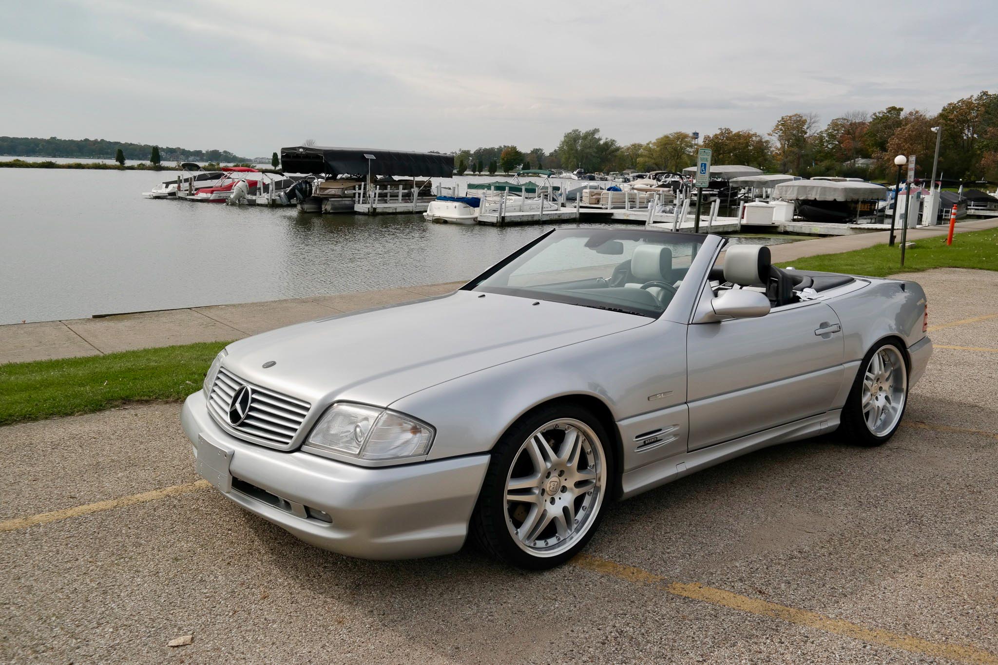This Brabus-modified 2002 Mercedes-Benz SL500 Silver Arrow features a 5.8-liter V8, 19-inch Brabus Monoblock VI wheels, and a two-tone leather interior. It’s finished in Silver Arrow Metallic with visible Brabus badging.
