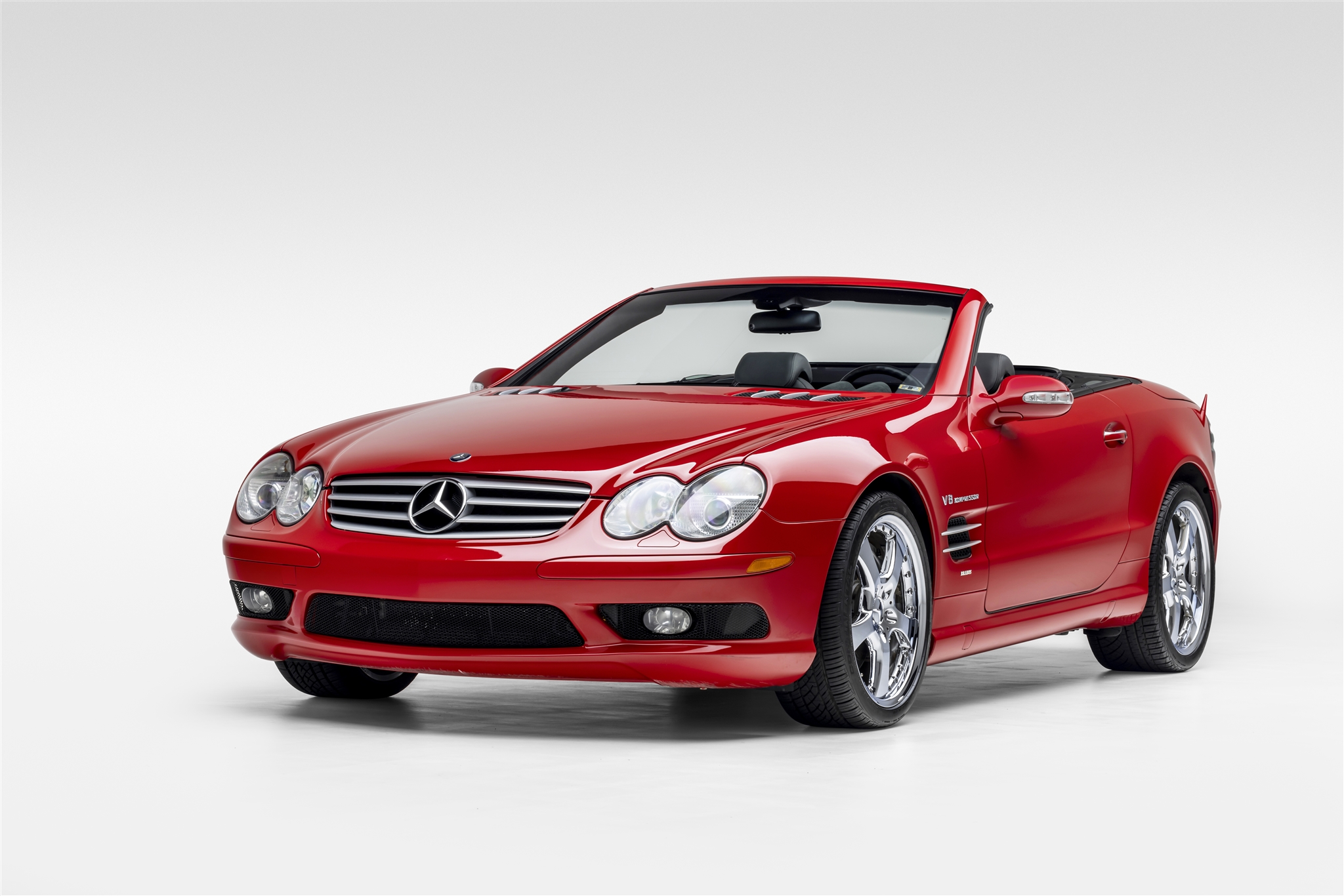 This 2003 SL55 AMG is finished in Magma Red and features Brabus K8 modifications including a supercharger underdrive pulley, sport exhaust, and ECU tune. It sits on 19" Lorinser wheels and has a power-retractable hardtop.
