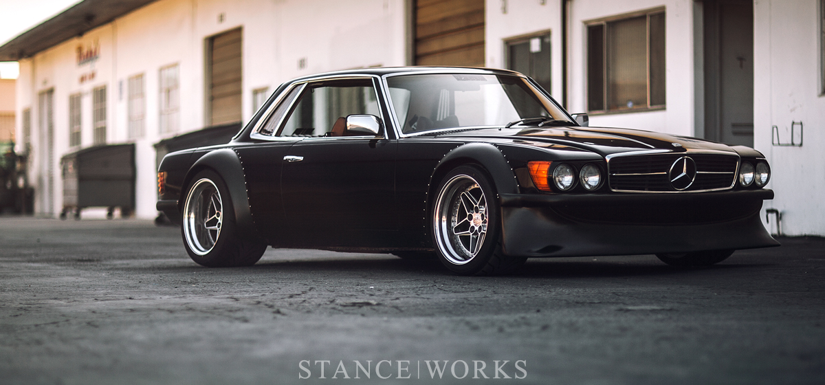 Mike Poll Jonker crafts a unique widebody Mercedes 450SLC featuring his bespoke overfender kit and custom Fifteen52 Bergmeister wheels. The satin black overfenders subtly contrast with the factory black paint, complementing the aggressive stance and polished brightwork.