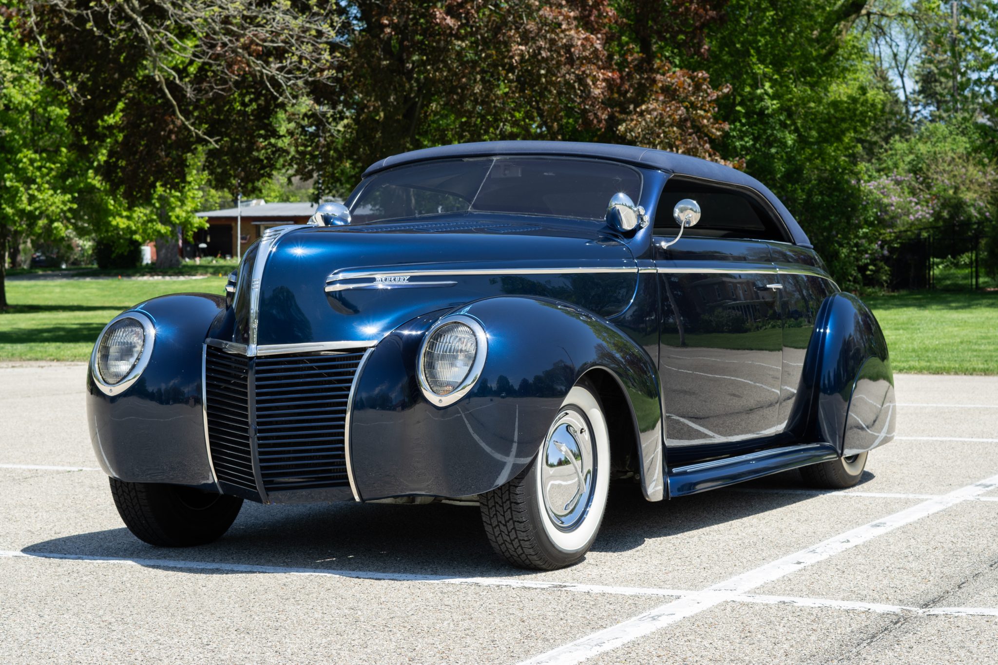 This 1939 Mercury Eight Coupe boasts a striking metallic blue finish with custom pinstriping. The build includes a chopped Carson roof and a Chevy 350ci V8, offering both style and performance. The coupe features classic hot rod elements like a louvered hood, rear fender skirts, and dual spotlights.