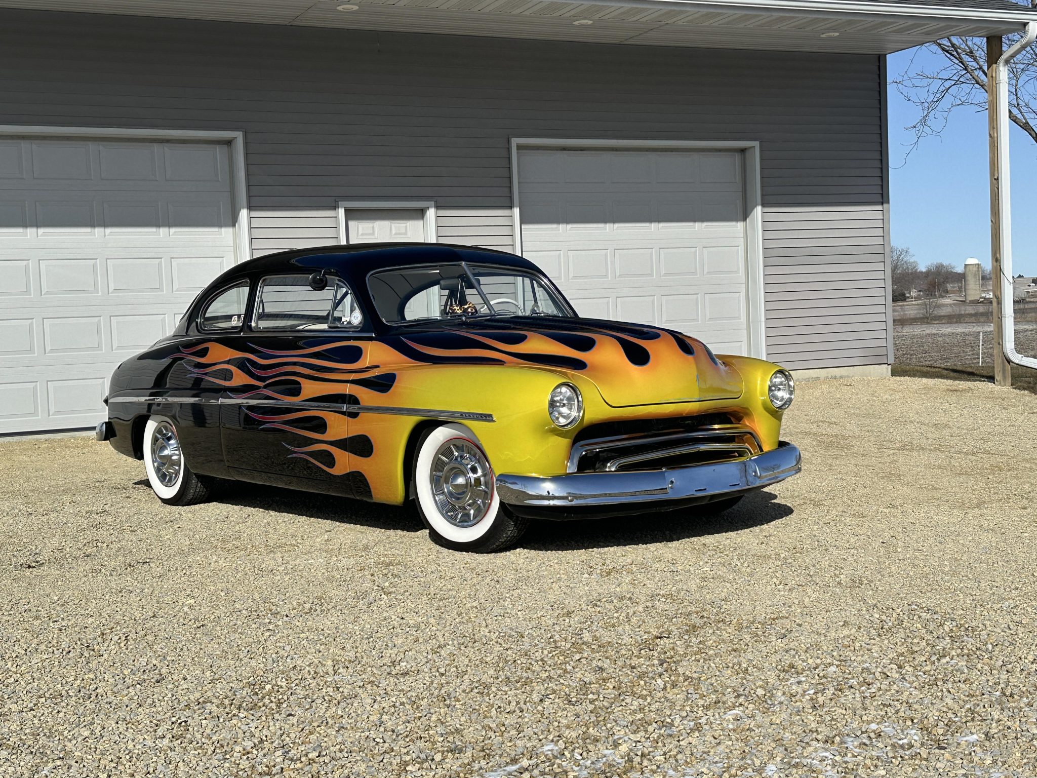 This 1949 Mercury Eight Coupe showcases a custom hot rod style with its striking black base adorned with orange and yellow flames. Fitted with a 350ci V8 engine, this lead sled features shaved door handles, a louvered hood, and frenched antenna for a sleek appearance. The distinctive body modifications and vibrant paintwork make it a standout example of classic American custom culture.