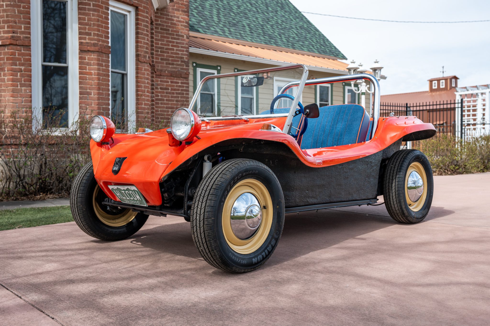 This Meyers Manx dune buggy is a vibrant blend of Tangerine Red gelcoat and blue Levi’s denim upholstery, built on a 1960 Volkswagen Beetle chassis. It features a 1,562cc flat-four engine, yellow 15" steel wheels, and distinctive chrome dual exhaust. A roll bar and blue metal-flake steering wheel add to its unique charm.