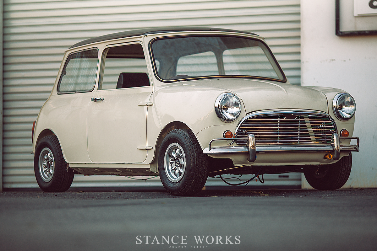 This 1969 Morris Mini Mk2 restoration by StanceWorks brings a charming balance of vintage appeal and modern sportiness. Coated in Old English White, the Mini features classic elements like sliding windows and a Mk1 grill, while upgrades such as Cooper S disc brakes and adjustable suspension aim for performance on canyon roads.