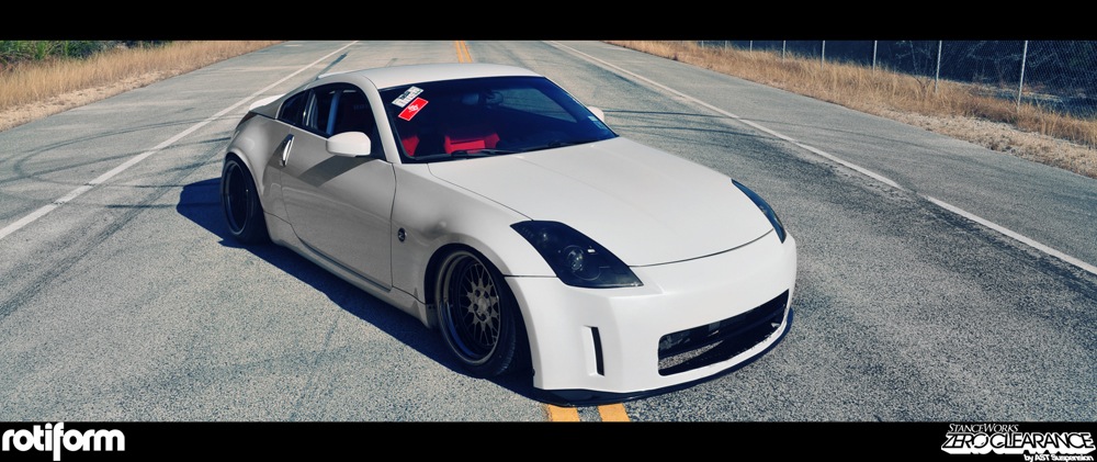 This exceptionally low Nissan 350Z, crafted for both street and competitive drift use, features the groundbreaking StanceWorks and AST ZeroClearance coilovers. With its striking white finish and Rotiform SJC wheels in black chrome, this build marries extreme aesthetics with functionality.