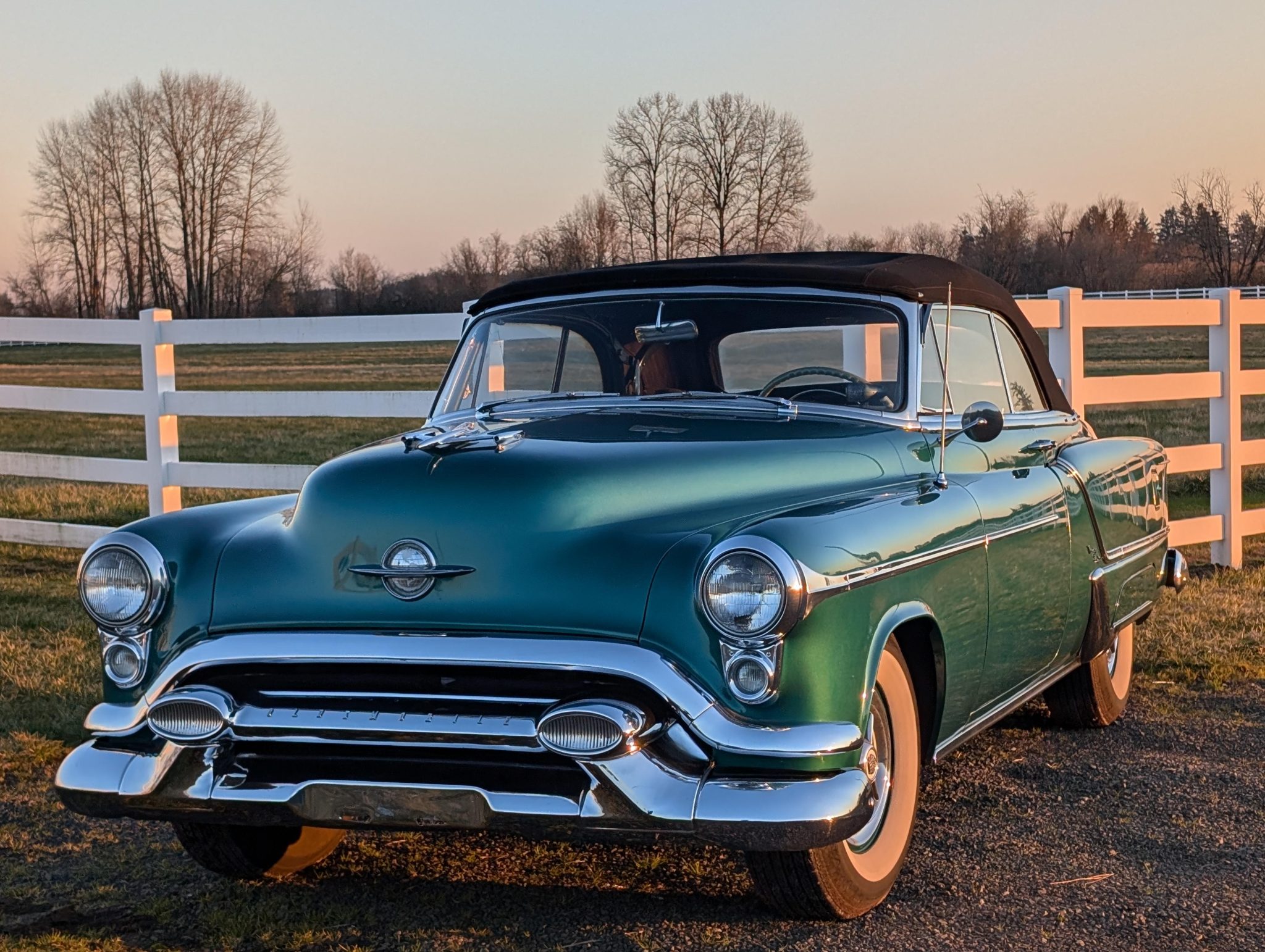 This 1953 Oldsmobile Ninety-Eight Convertible Coupe, finished in metallic teal with a black power-operated convertible top, embodies classic American style. Powered by a 303ci Rocket V8 with a Hydra-Matic automatic transmission, it features period-correct details like wide whitewall tires, chrome trim, and a plush teal and green interior.
