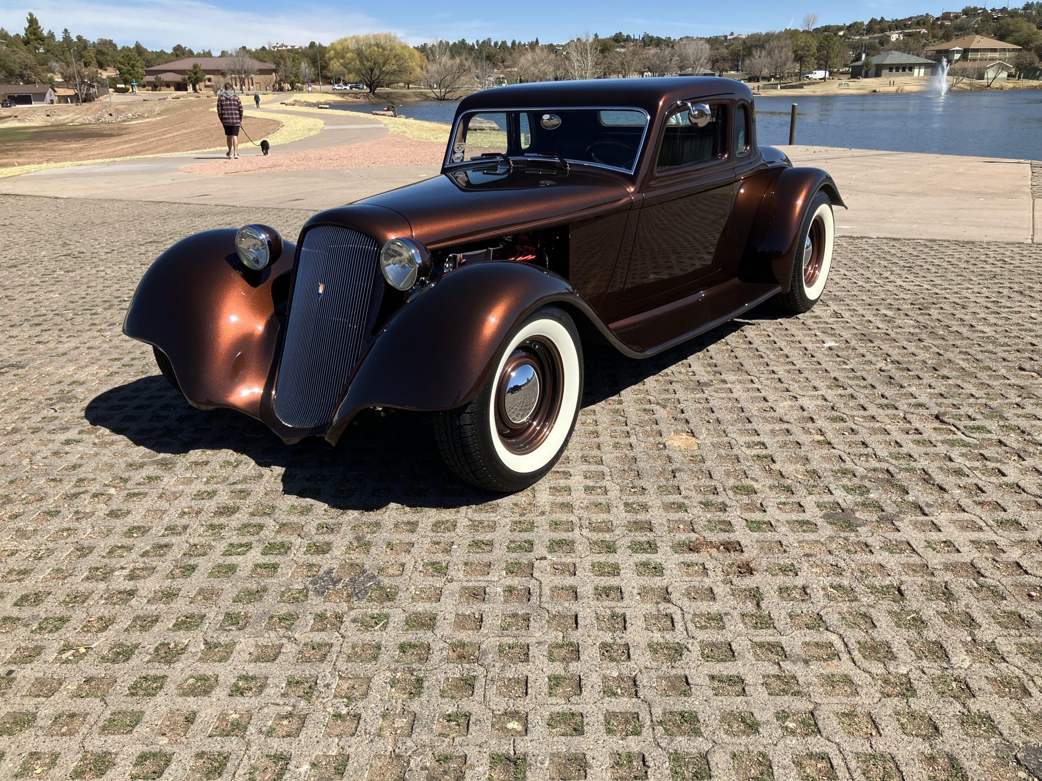 This '33 Plymouth-style street rod features a fiberglass body and a custom-built chassis, powered by a 360ci V8 with an A727 automatic transmission. The coupe is painted in Chrysler Western Brown and showcases a blend of classic and modern elements with adjustable coilovers, Wheel Vintiques smoothies on whitewall tires, and a chopped-and-channeled body design.