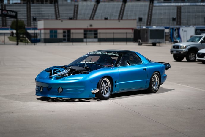 This Pontiac Firebird Formula has been meticulously built by Justin Cavazos, together with Jason Flores of Straightline Performance, for no-prep drag racing. Starting with a bare shell, they added a ladder bar suspension and a Burkhart Chassis 9-inch rear end. The body features fiberglass components from VFN and a junkyard roof replacement. Powering the car is a re-sleeved 5.3-liter LS block with methanol fuel, a forged crankshaft, and a DS Racing 92/110 turbocharger, estimated at 1,200 horsepower. The setup includes a two-speed Powerglide transmission and a Holley Dominator ECU. The car's performance was proven with a personal best of 5.01 in the eighth mile.