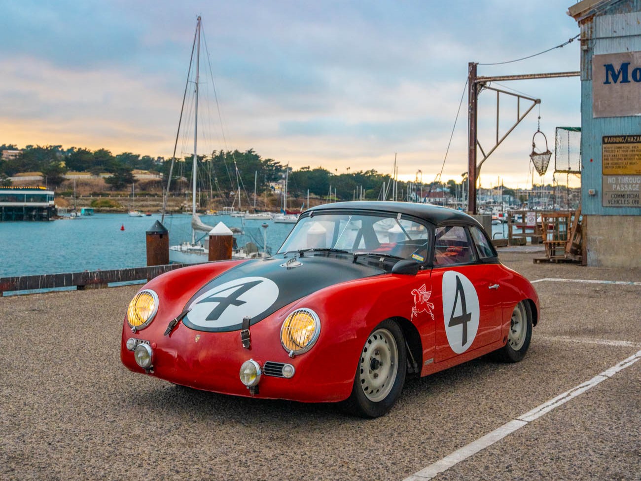 This 1958 Porsche 356A was transformed by Emory Motorsports into a vintage race car, featuring a 1,620cc flat-four engine with dual Solex carburetors, Ahnendorp exhaust, and four-wheel disc brakes. It sports a striking red and black paint job, removable hardtop, and race-ready details like a roll bar and driving lights.