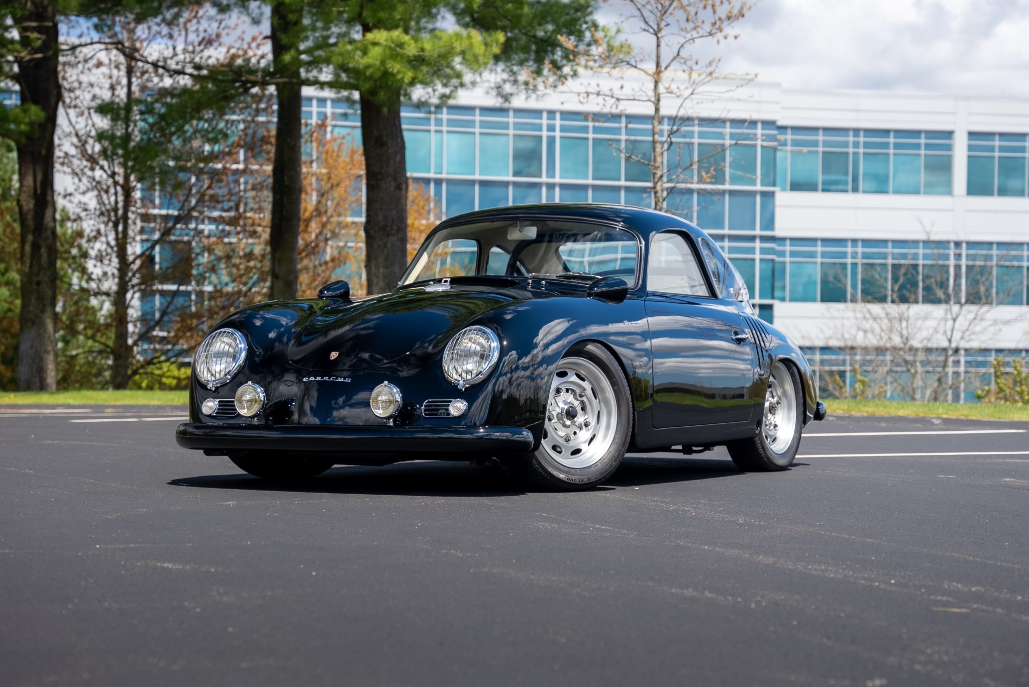 This black 1958 Porsche 356A Emory Special features custom bodywork by Emory Motorsports, including a sunroof and louvered panels. It sports 16-inch billet aluminum wheels, a 2.5L Polo flat-four engine, and a five-speed transaxle.