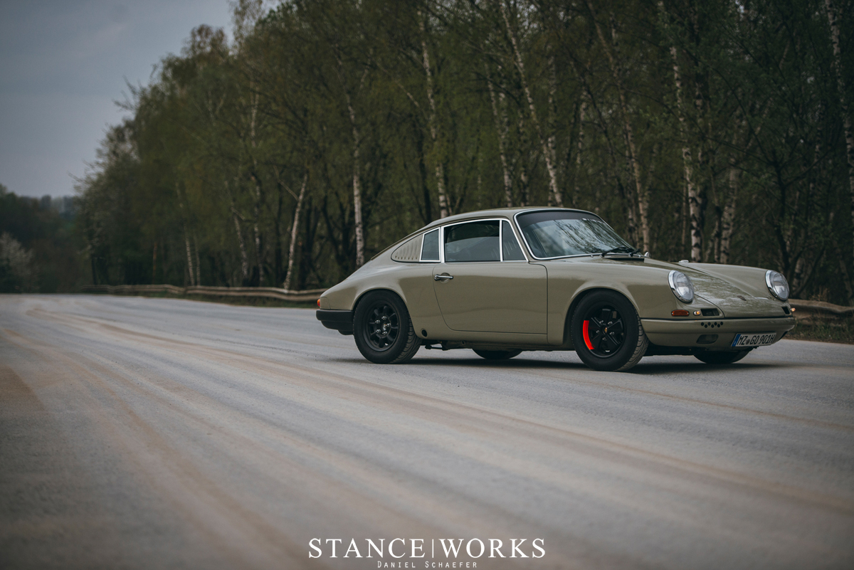 This meticulously restored Porsche 911 by Markus Haub embodies the essence of early racing Porsches with a stone grey exterior and bright red graphics. Original and period details like the '911R' style rear lights and customized interior instruments set it apart as a unique classic.