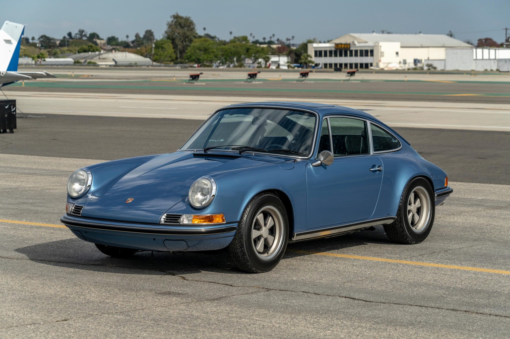 This Gemini Blue Metallic 1971 Porsche 911S coupe, modified by RUF, features flared rear wheel arches, a RUF Bilstein suspension, and 15-inch Fuchs wheels. It houses a twin-plug 3.4L flat-six engine and boasts a custom six-speed manual transaxle.