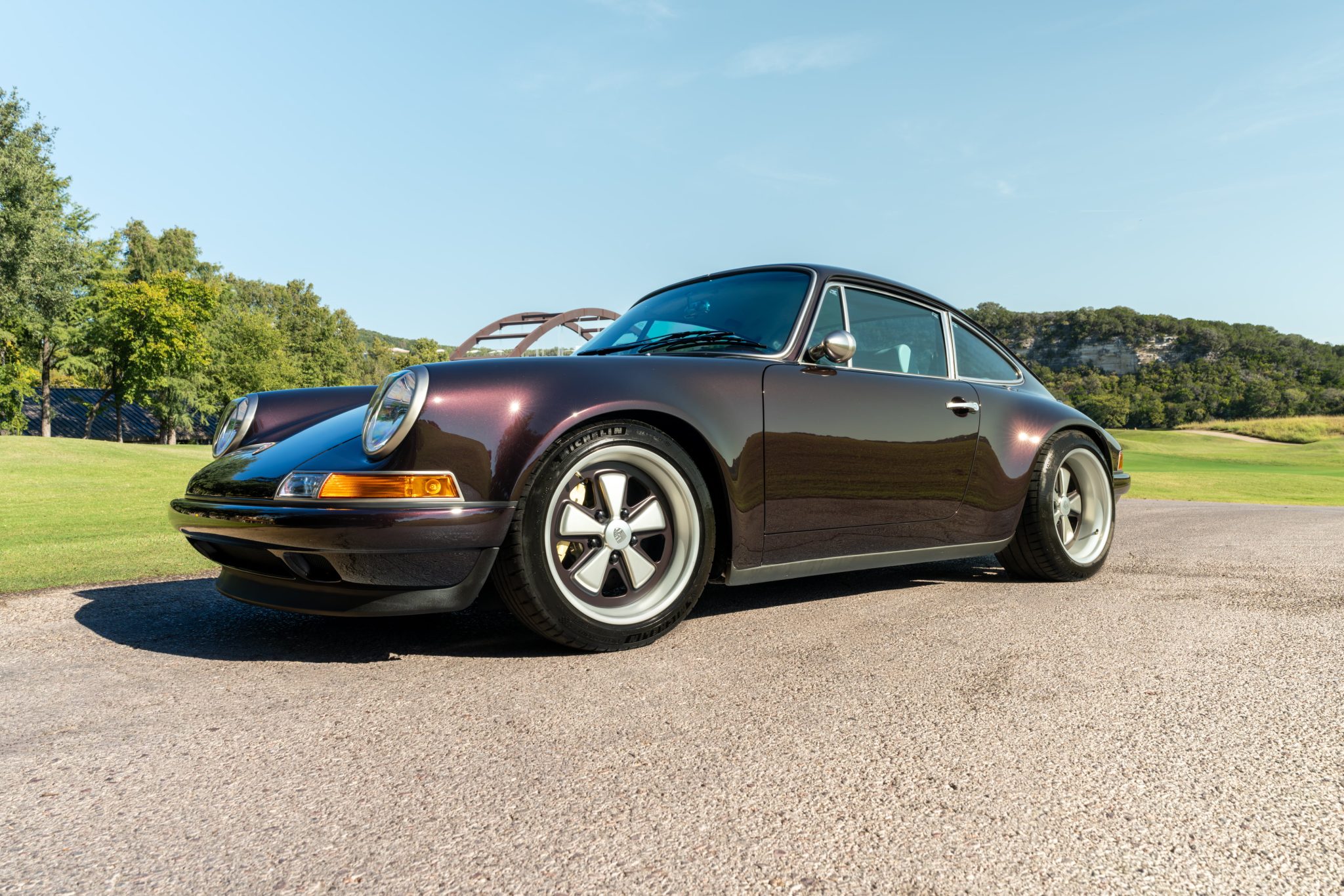 This Singer-modified 1990 Porsche 911 features a custom build with a 4.0-liter flat-six, carbon-fiber panels, and a striking Aubergine Metallic finish. It showcases staggered 17” forged wheels, Öhlins dampers, and a luxurious Platero leather interior.