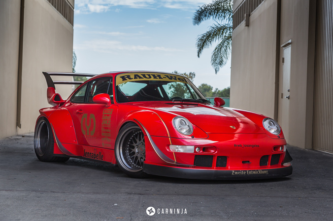 This RWB-modified 1995 Porsche 911 Carrera features a widebody design with a Kamiwaza wing and Rotana canards. It sits on RWB-LA custom three-piece forged wheels and sports an ERP-modified suspension setup.