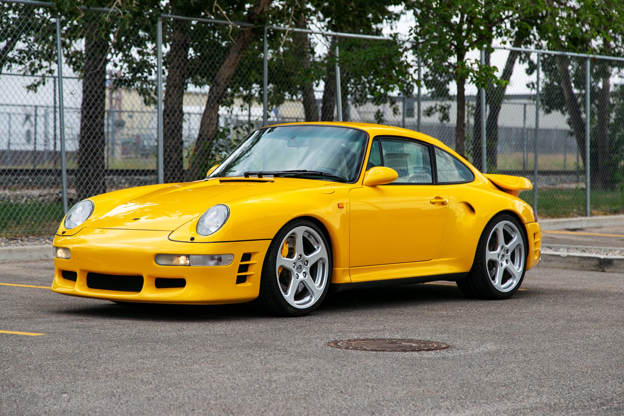 RUF-modified 1997 Porsche 911 Turbo in yellow, featuring RUF CTR bumpers, 19″ RUF wheels, and a fixed rear spoiler. The interior sports RUF racing seats and ivory leather upholstery. The build includes a RUF-prepared twin-turbo 3.6-liter engine producing 500 hp.