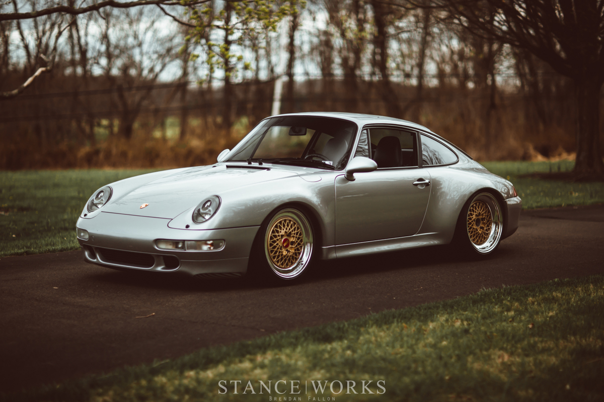 This Arctic Silver 1998 Porsche 993 Carrera S embodies subtle elegance with its BBS E50 magnesium wheels, H&R AH Deep coilovers, and a refined aircooled engine tone thanks to a Fister II muffler. It's a beautifully maintained classic that retains its original charm while offering improved handling.