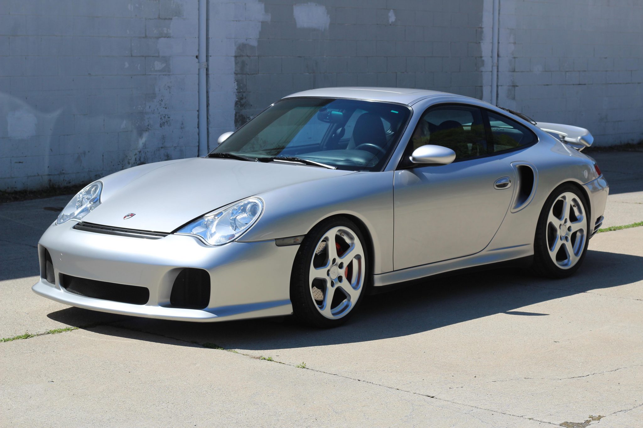 Ruf-modified 2003 Porsche 911 Turbo finished in Arctic Silver, featuring Ruf 19" wheels and lowered Bilstein coilover suspension. The car includes a Ruf active front air dam and hydraulically controlled rear wing.