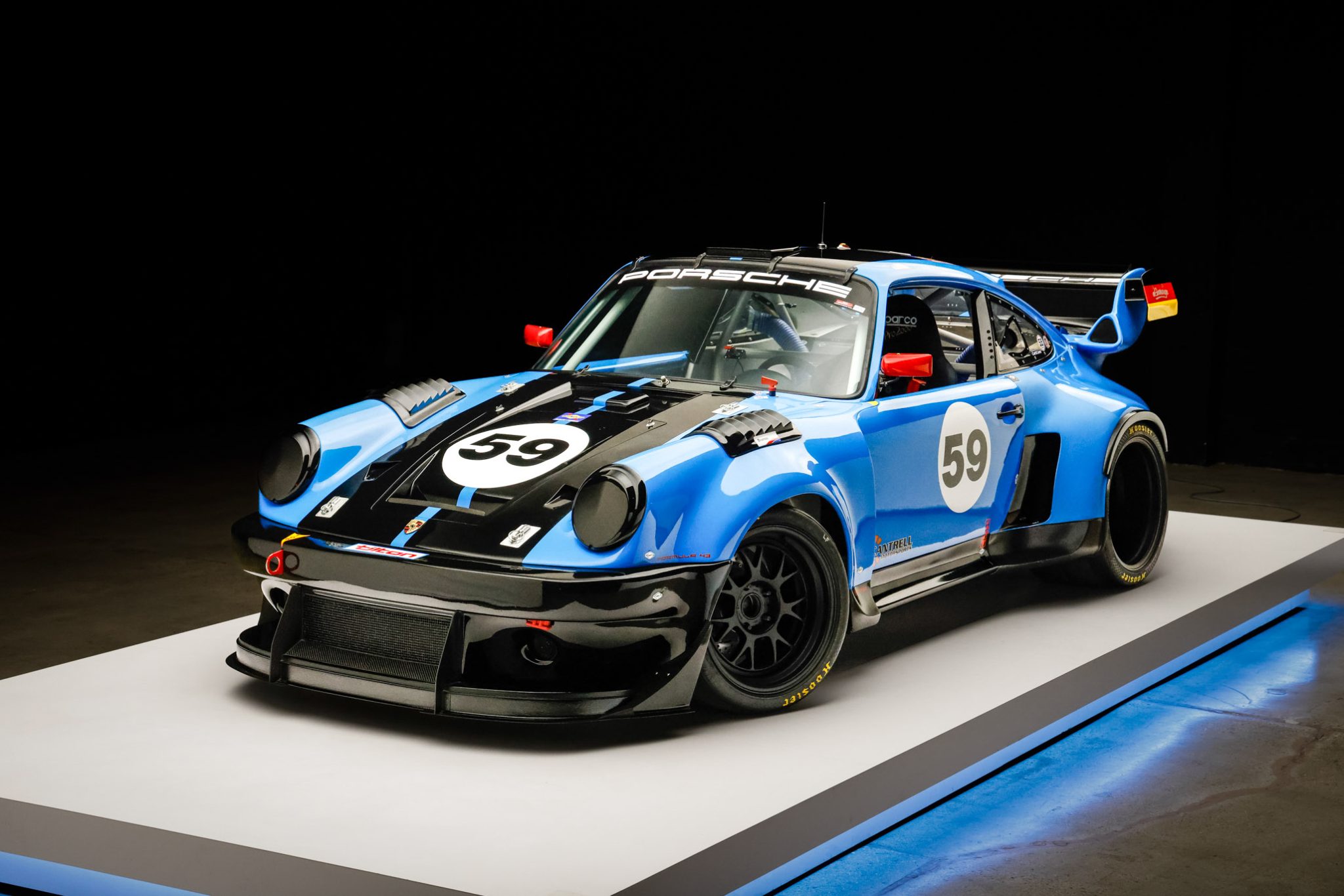 This 1977 Porsche 911S, finished in striking blue and black, features an extensive race-ready transformation including a 3.8L flat-six engine, a fiberglass body kit with RSR-style elements, and a race-prepped interior. With a powerful stance and visual impact, it's equipped with Brembo brakes and Fox Racing shocks to handle the track.