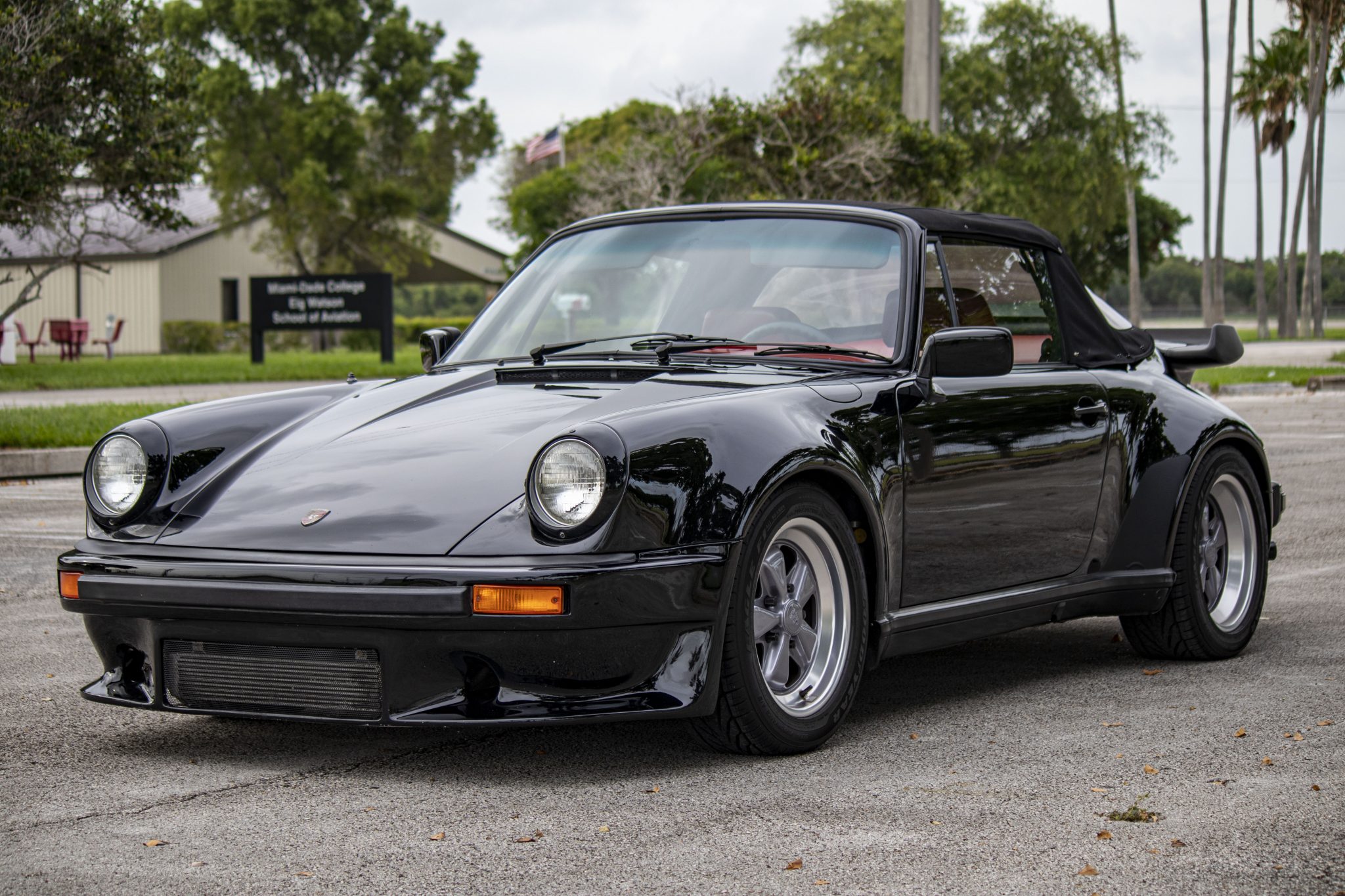 This 1981 RUF Turbo Cabriolet, built from a bare shell, is finished in black with a red leather interior. It features RUF-modified turbocharged 3.3L flat-six, 16" Fuchs wheels, Turbo-style bodywork, and an adjustable wastegate.