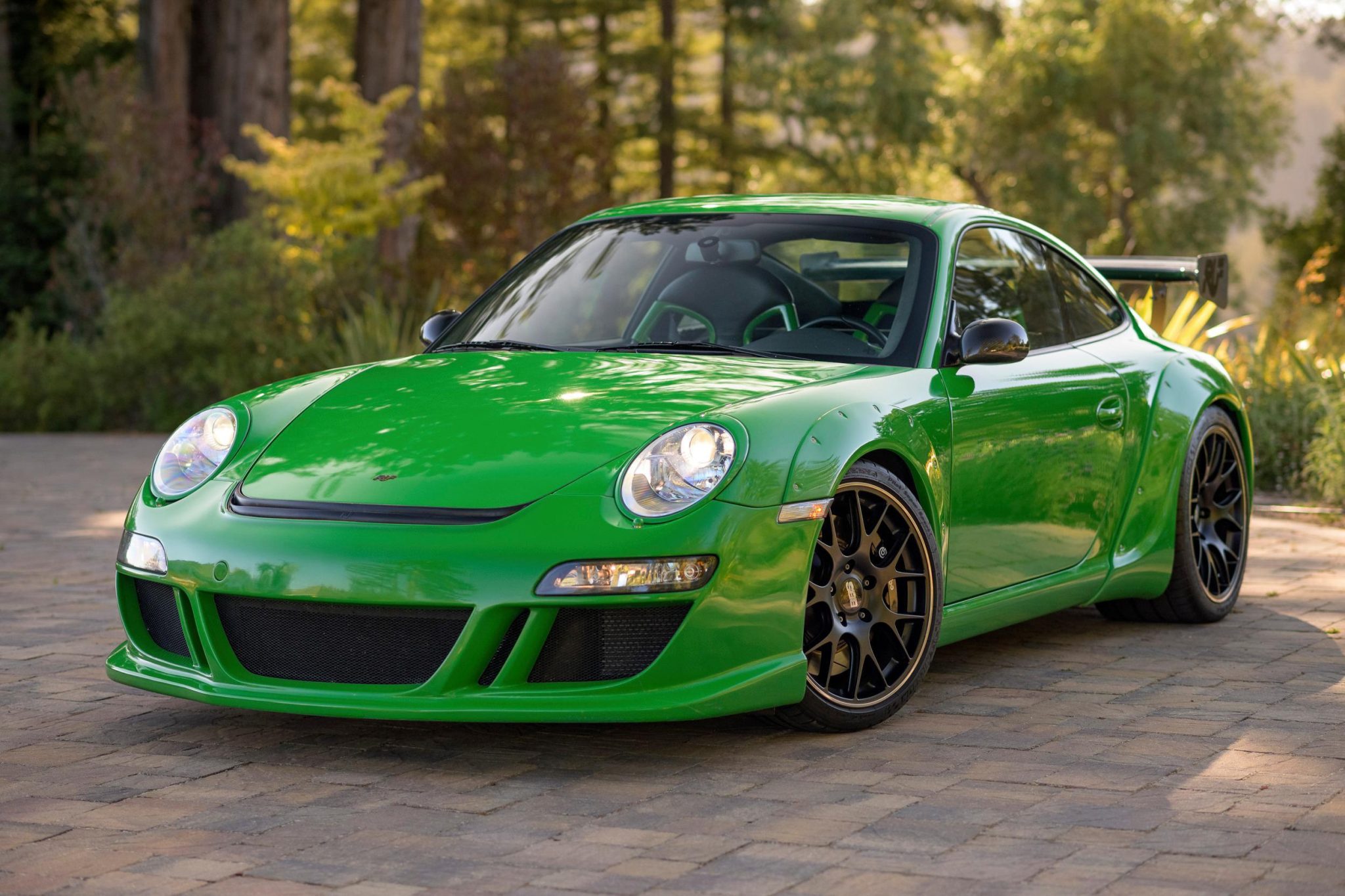 Viper Green RUF RGT with SharkWerks-modified 3.9L flat-six and six-speed manual. Features include a carbon-fiber aero package, black 19” BBS CH-R wheels, RUF Bilstein suspension, and Recaro seats with six-point harnesses.