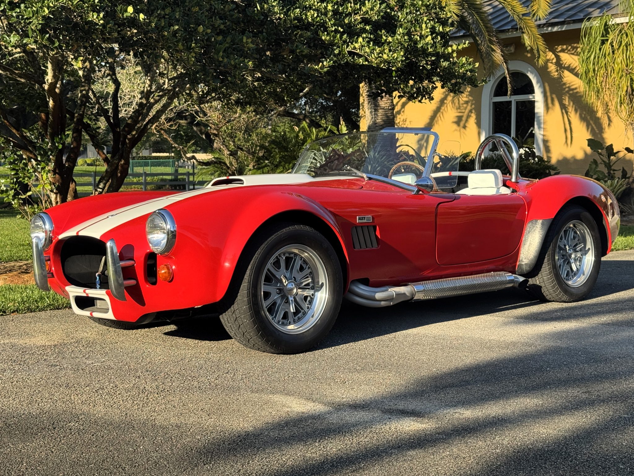 This Classic Roadsters Cobra replica dazzles with its red finish and white racing stripes, channeling the classic race car aura. It's equipped with a 351ci Windsor V8 and features a Richmond Gear five-speed manual transmission. The car boasts Halibrand-style wheels, a roll hoop, hood scoop, and side-exit exhaust, embodying a true Shelby spirit.
