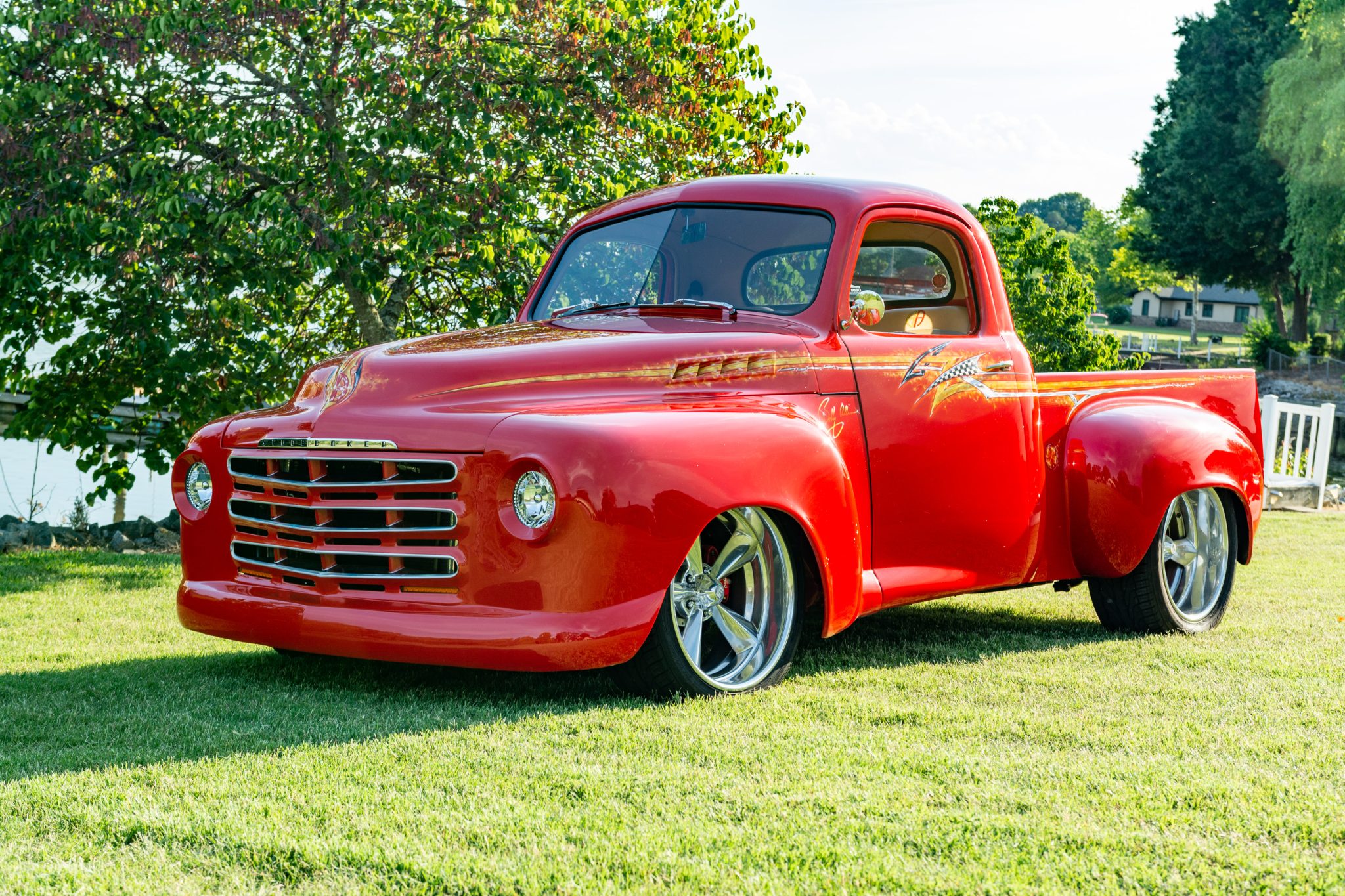 This striking custom 1950 Studebaker 2R5 Pickup features a vibrant red finish with flame-accented airbrushed graphics. Built on a modified Buick Grand National chassis, it boasts a turbocharged 3.8-liter V6, 20” alloy wheels, and Hotchkis suspension components, merging vintage charm with modern performance and style.