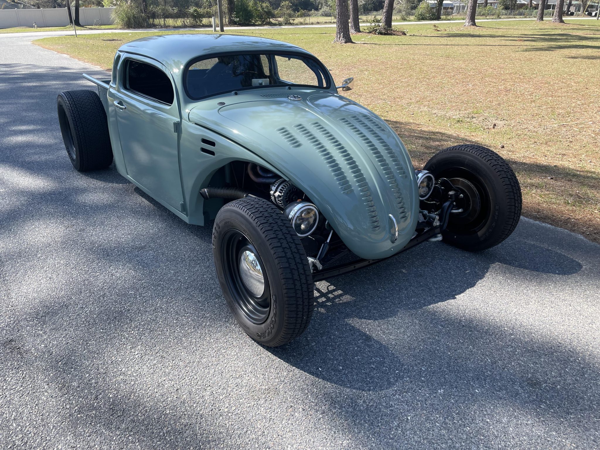 This unique hot rod pickup features a heavily customized 1969 Volkswagen Beetle body with portions from a 1949 Chevrolet pickup. It houses a front-mounted 5.3-liter V8 and is finished in striking green with multicolor pinstriping. Its chopped roof and custom louvered hood create a distinctive appearance.