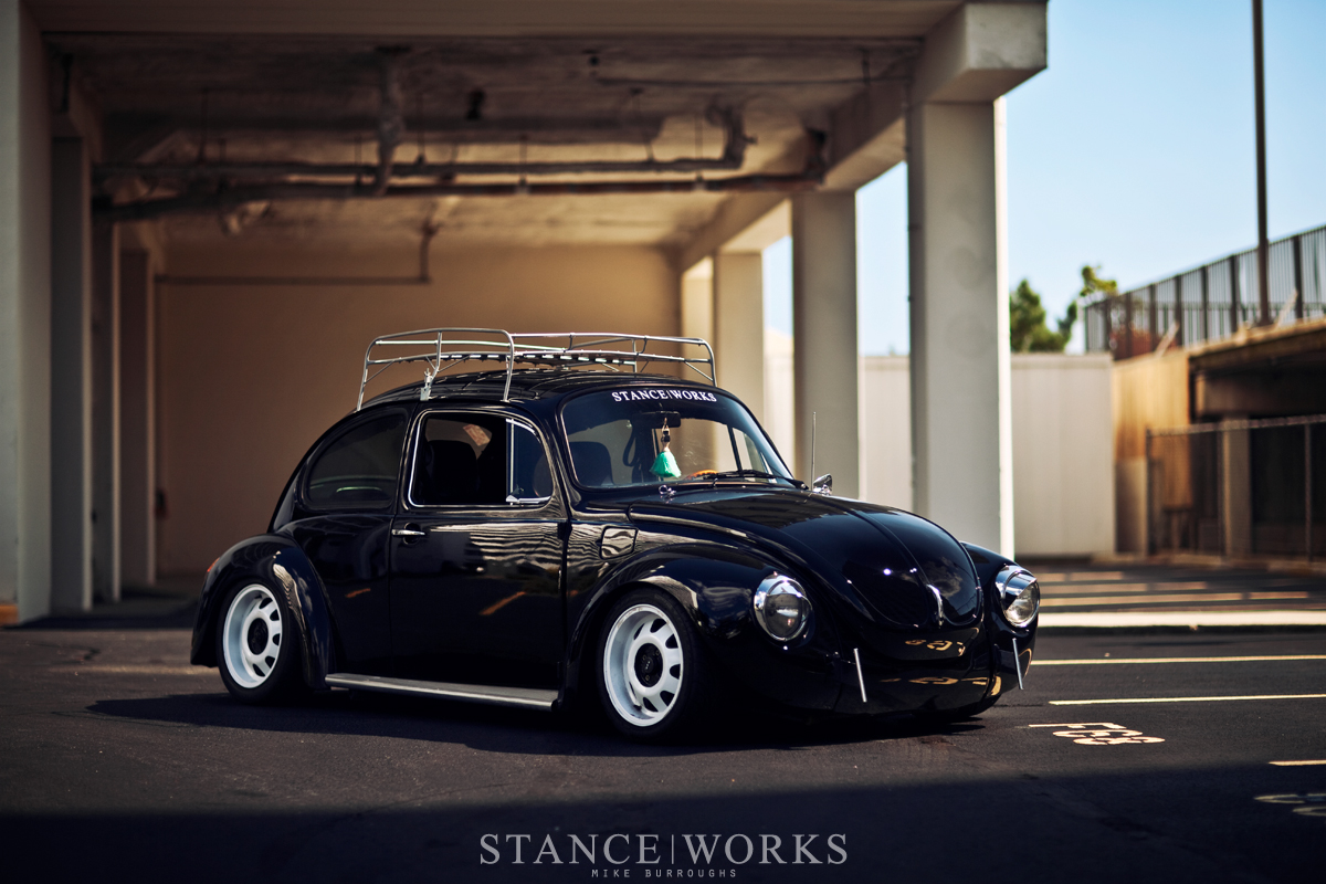 Brennan Lewellen's 1973 Turbo Super Beetle, colloquially known as 'The Boog', boasts a striking mirror-finish black paint and sits incredibly low thanks to custom coilovers. Its history as a drag and Baja Bug is evident in its unique modifications, like the extended T3 turbocharger sticking out the back, capturing attention wherever it goes.