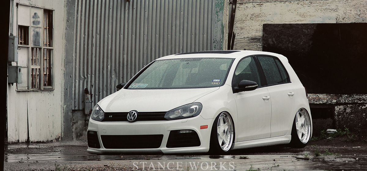 Joshua McDowell's Volkswagen MKVI R features a striking white-on-white color scheme with custom Image Wheels in an 18x9 setup. The hatchback is equipped with a Bagyard air suspension setup, offering a sleek stance and impressive power estimated at around 340hp.