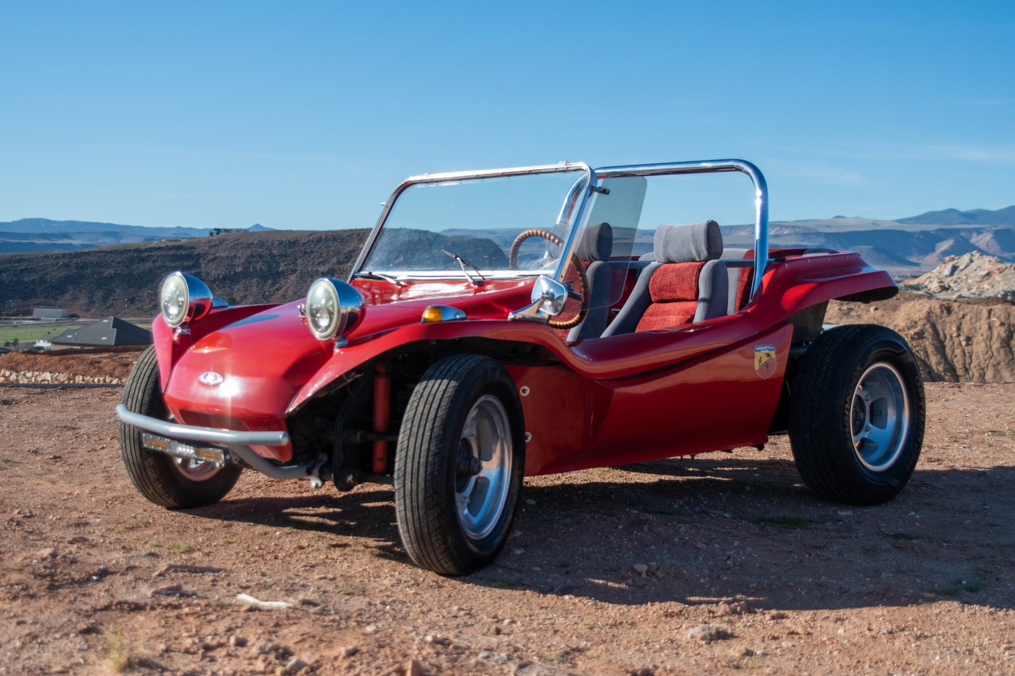 This vibrant red dune buggy features a fiberglass body on a modified Volkswagen chassis, powered by an air-cooled 1.6L flat-four engine. Accentuated with color-matched sidepods, gray-finished bumpers, and 15-inch alloy wheels, it blends vintage flair with modern touches including a Weber carburetor and EMPI shifter.