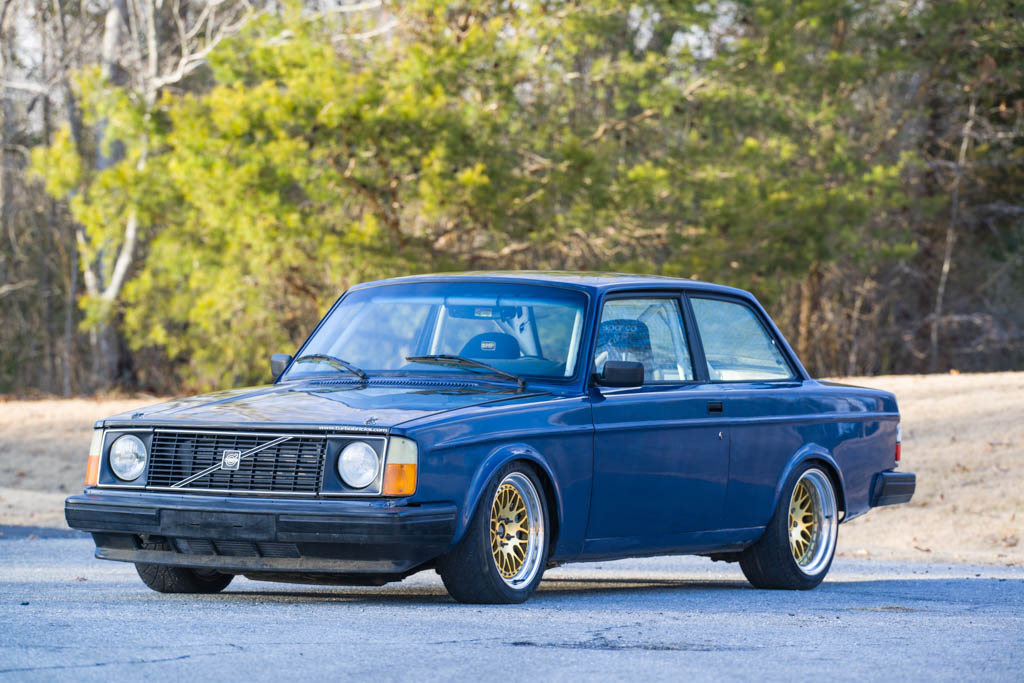 This 1981 Volvo 242 is a highly modified street-legal track car, featuring a powerful B230FT engine stroked to 2.5 liters with a Bullseye Power S256 turbo, delivering 350 wheel horsepower. Originally a DE car, it sports a metallic blue finish, a six-point cage, Sparco and OMP seats, and prepared for drifting with extensive suspension upgrades and brake modifications.